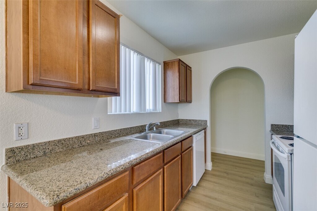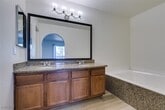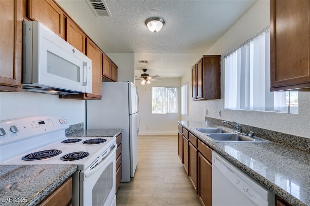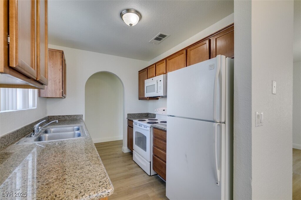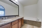 Granite countertops, carpet/ hardwood flooring, community pool & spa, all appliances included, extra lrg tub in master bathroom, patio off master bedroom, washer/dryer in storage room stained glass shower in 2nd bath