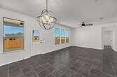 Beautiful single-story home featuring an open floor plan with 9-ft ceilings and a spacious great room. The modern kitchen is equipped with Woodmont® flat-panel 42-in upper cabinets in Espresso, durable laminate countertops, and a seamless flow into the main living area. A private den offers the perfect space for a home office or study. The primary suite includes a generous walk-in closet and an ensuite bath with Silestone® countertops, a dual-sink vanity, a marble garden tub, and a separate shower with tile surround. Additional upgrades include tile flooring throughout, Sherwin-Williams® zero-VOC interior paint, cordless blinds, ceiling fans in the great room, den, and all bedrooms, plus an ecobee3 lite smart thermostat. Enjoy outdoor living under the covered back patio — ideal for entertaining or relaxing.