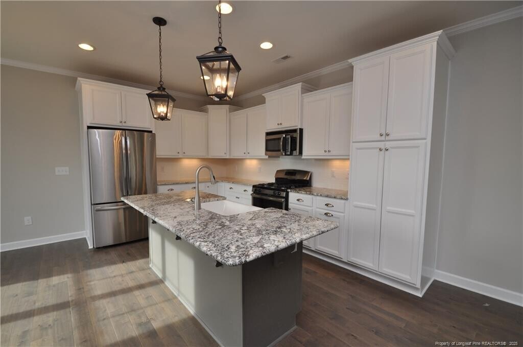 This stunning end unit Wake Forest townhome is a former model & loaded with high-end finishes & upgrades throughout. Come visit today and prepare to fall in love! Its open-concept & welcoming floorplan boasts hardwoods, tall ceilings & ample natural light throughout the 1st floor. The sprawling family room with a cozy corner fireplace is open to the dining area as well as a magnificent chef's kitchen boasting granite counters, a sleek stainless appliance package, a tiled backsplash, LED under-cabinet lighting, a farmhouse sink, an island & more. Be sure to visit the lovely screened-in porch & patio with a sparkling community pool just behind your home. Head upstairs where you'll find the luxury primary suite offering 2 walk-in closets & an en-suite bath featuring dual sinks, a tiled shower with 2 shower heads & a water closet. Bedrooms #2/#3 are both generously proportioned with easy access to a full hall bathroom. Don't miss the bonus room! Washer/dryer/refrigerator are all included.