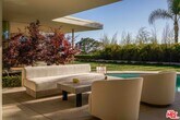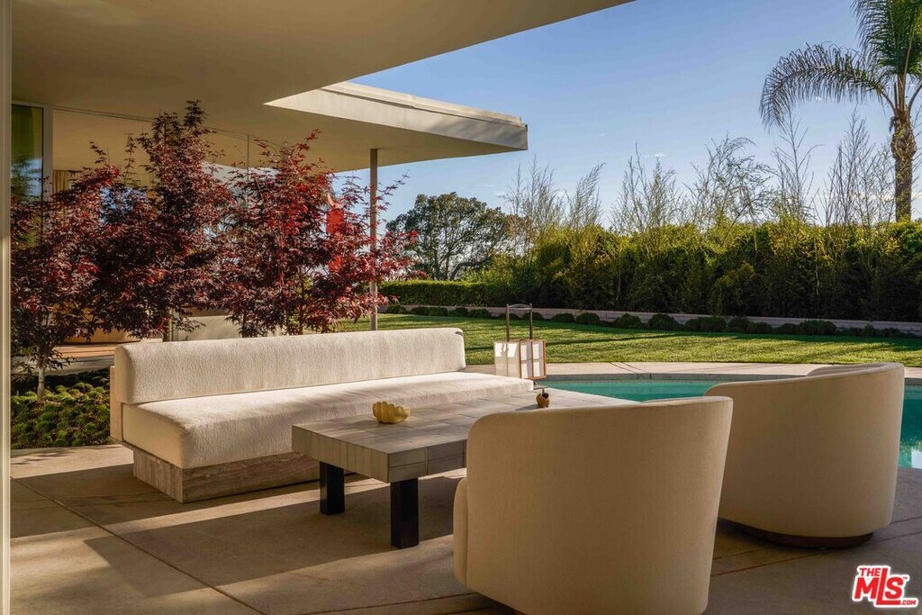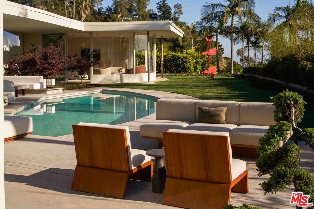 One of the finest mid-century architectural homes in Trousdale, OSKLO House sits on a flat half-acre lot with sweeping views of West LA. Designed by Benton & Parks AIA in 1966 and completely reimagined by OSKLO, this approx. 6,200 SF estate blends iconic design with modern luxury. A dramatic courtyard with a sculptural fountain sets the tone for the fully furnished, turnkey residence. Inside, the living room features an oversized fireplace and floor-to-ceiling windows, creating a striking introduction to the home. Custom OSKLO furnishings, museum-quality antiquities, and curated vintage pieces beautifully complement the rich materials and finishes throughout. No expense was spared. The kitchen embodies classic Beverly Hills living, complete with a breakfast nook, butler's pantry, and a wall of windows opening to the garden. The primary suite, showcasing nearly $1 million in stonework, offers wraparound windows overlooking the backyard and city lights beyond. A long hallway above a Japanese-inspired atrium leads to three ensuite bedrooms, with an additional ensuite near the kitchen and a pool bath by the outdoor cabana ideal for hosting.Outside, the angular pool pavilion includes multiple lounge areas, a swimming pool, fire pit, and outdoor bar, capturing the essence of Trousdale's signature indoor-outdoor lifestyle. MLS# 26659973
