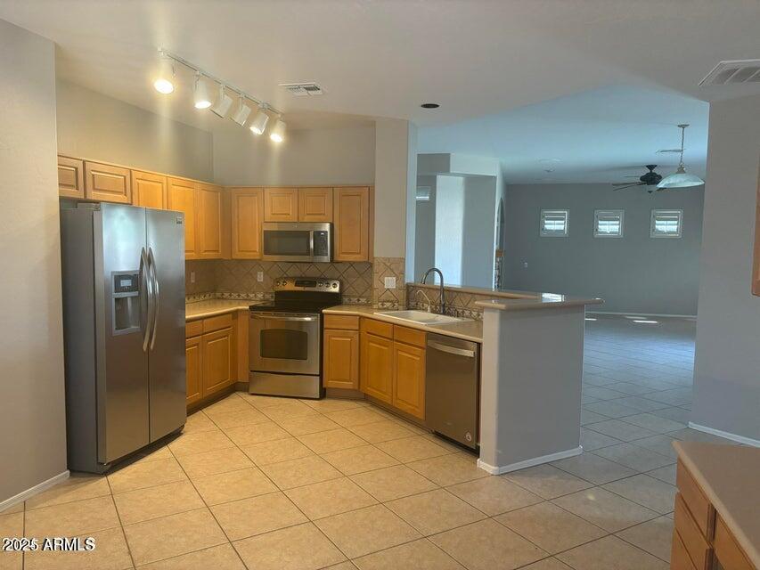 This 4 bedroom 2 bath home features new interior and exterior paint. New flooring and all new landscaping with turf grass in the backyard. Split master floor plan and entertaining kitchen area that overlooks the Great room. The additional bedrooms and bath are just down the hallway. This property is walking distance to the Estrella Elementary School and to the lakes.