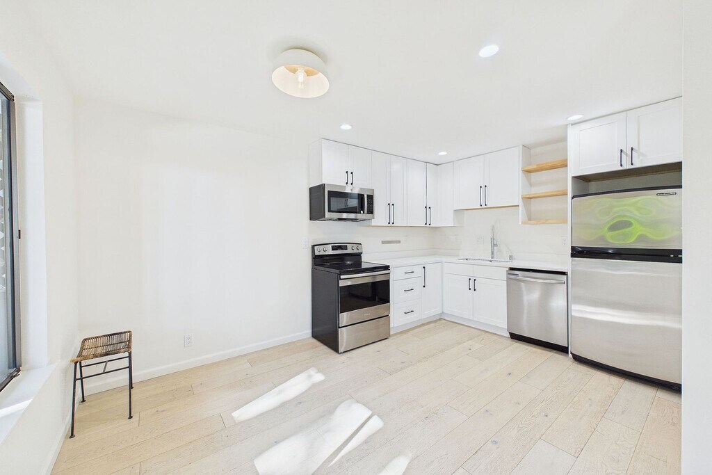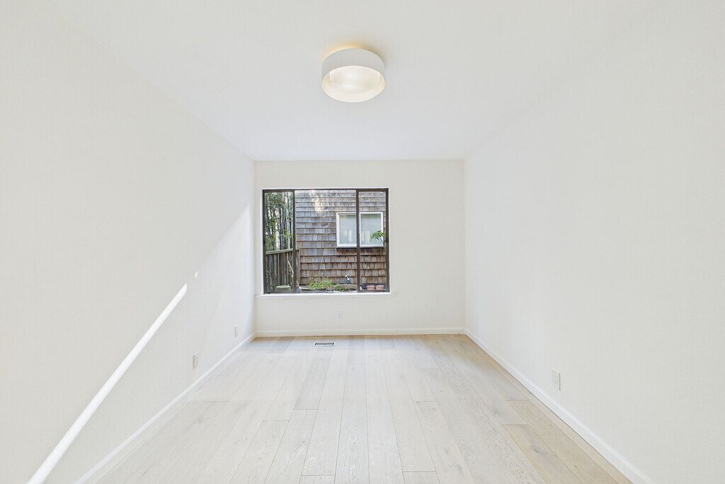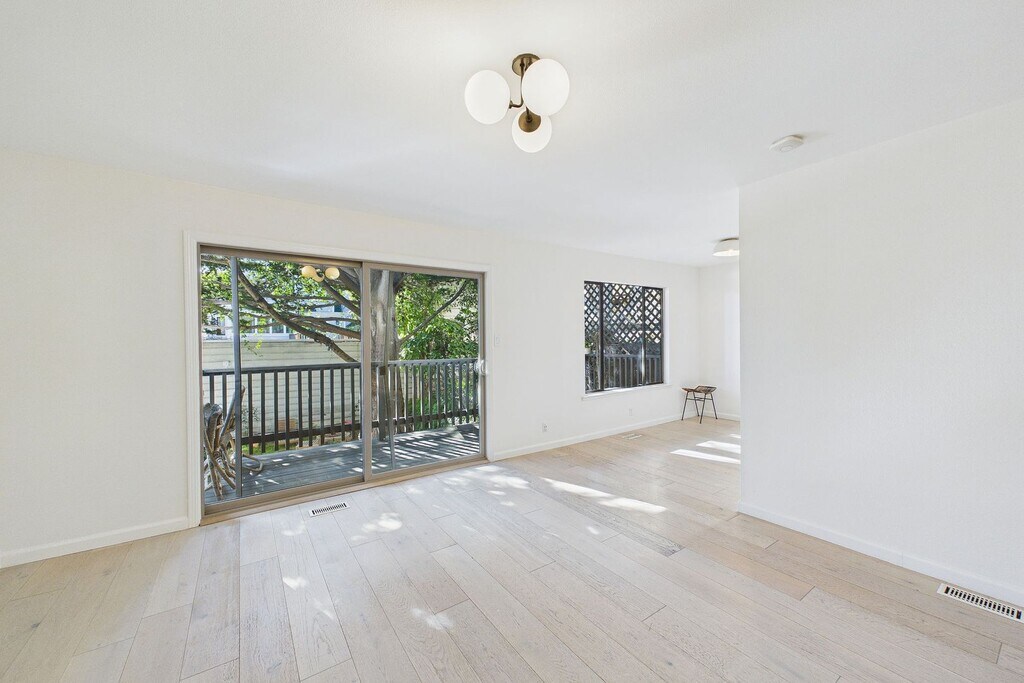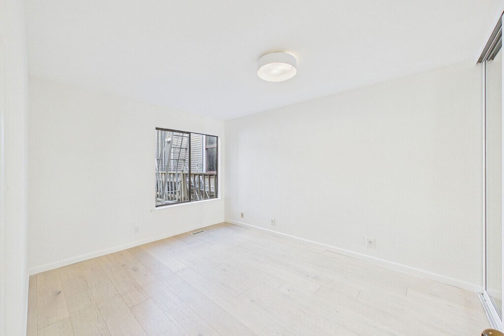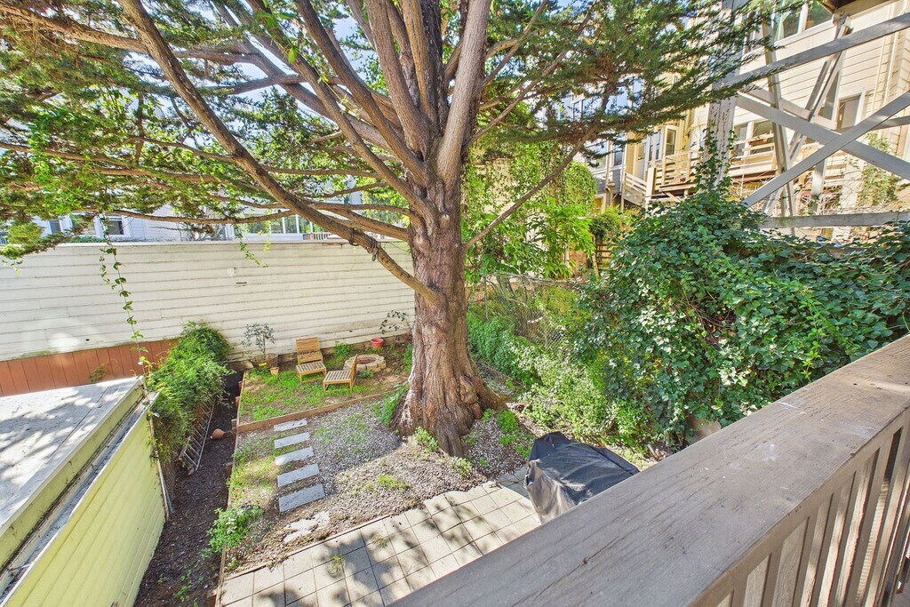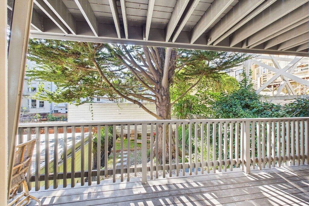 This quiet and comfortable condominium is ideally located at the rear of the building, offering excellent natural light and direct access to a spacious, private south-facing deck through patio doors — perfect for indoor-outdoor living. The bright, open floor plan seamlessly connects the living room, dining area, and remodeled kitchen, all oriented toward the deck. The home features two generous bedrooms with ample closet space, one full bathroom, and hardwood floors throughout. Both the kitchen and bathroom have been tastefully remodeled, creating a clean, modern feel. Additional highlights include a shared south-facing garden with a mature Cypress tree, one-car deeded parking, and extra storage in the garage. Pets are welcome. Located at 1869 Turk Street in San Francisco, this home is a true Walker’s Paradise with a Walk Score of 95 — close to shops, dining, transit, and neighborhood conveniences, while still offering peace and privacy.