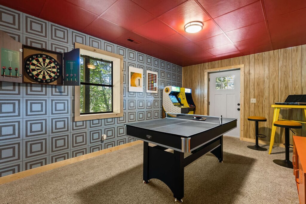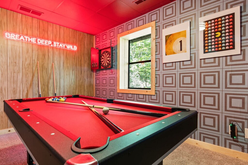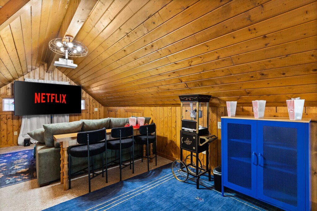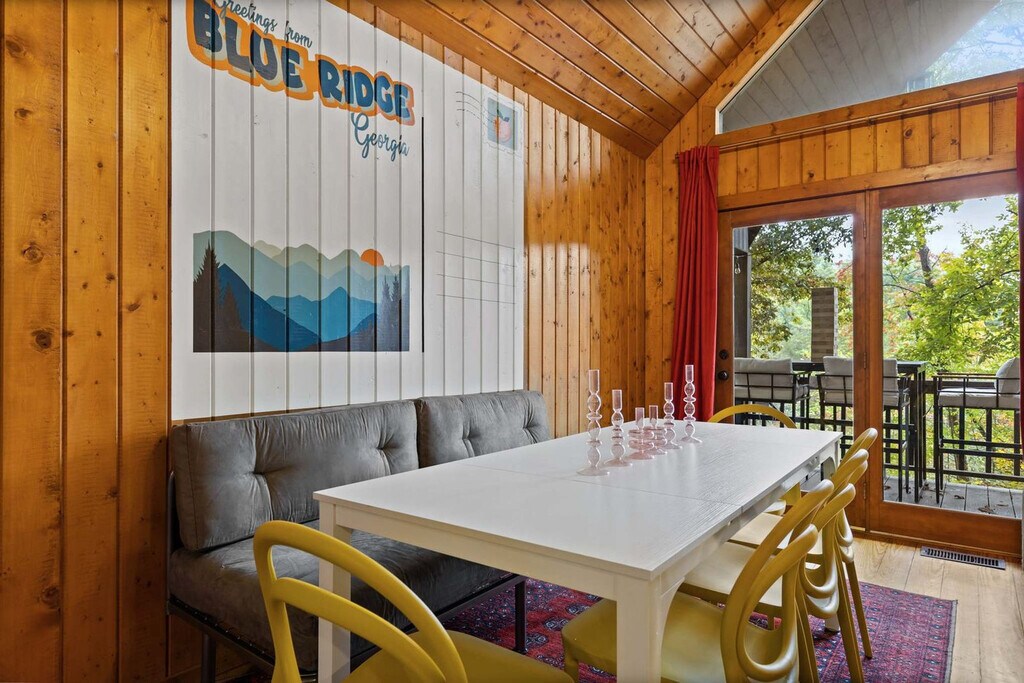 Feel at home in this stunning 4-bedroom mountain cabin in Blue Ridge, GA, that comfortably accommodates up to 14 guests, making it ideal for families, friends, or multi-family vacations! This home perfectly blends rustic charm with modern comfort. Step inside to find soaring ceilings, cozy living spaces, and panoramic views of the surrounding nature. Gather around the stone fireplace, cook up a feast in the fully stocked kitchen with high-end stainless appliances, a large refrigerator, ample cabinetry and cooking space, and a coffee maker with Keurig and drip options, or head out to the deck. The fun continues outdoors with a hot tub, fire pit, kids playground, private sauna, private small dock, outdoor patio/dining, BBQ grill, giant Jenga, corn hole, kayaks, movie theater, and game room with a pool table, arcade games, poker, and darts. Up to 2 dogs are allowed for $125 per stay and long-term stays are available upon request. Nearby attractions include the Blue Ridge Scenic Railway (1.8 miles), Mercier Orchards (3.2 miles), Toccoa River Swinging Bridge (14 miles), Long Creek Falls (15 miles), and Blue Ridge Adventure Park (2.5 miles). Restaurants include The Black Sheep Restaurant (1.8 miles), Harvest on Main (1.8 miles), Chester Brunnenmeyer’s Bar & Grill (1.9 miles), Southern Charm Restaurant (1.7 miles), and Toccoa Riverside Restaurant (10 miles). Renting a car is a convenient option to explore the area. Check-in is at 4pm and check-out is at 10am. No parties are allowed and violations may result in immediate termination of the stay. [SI]