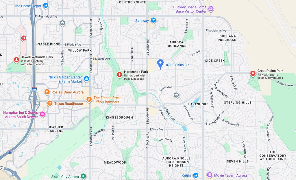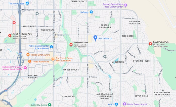 Located in the Aurora Highlands Neighborhood, 1871 S Pitkin Cir is in the 80017 Zip Code of Aurora, CO.