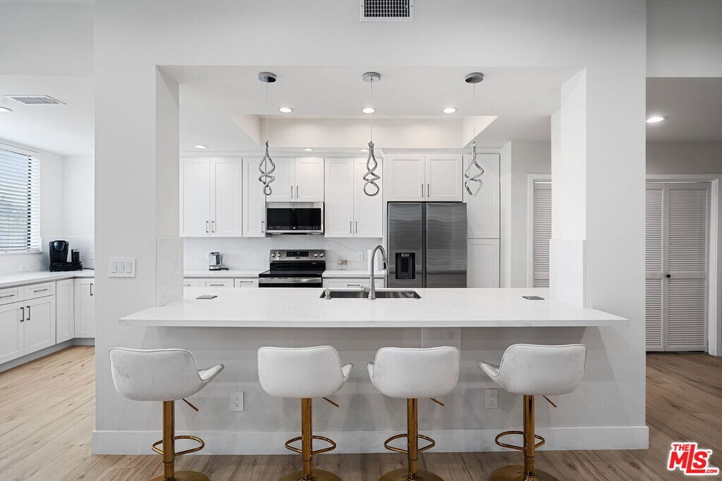 Welcome to this newly renovated 2-bedroom, 2-bathroom south-facing Westwood condo. Natural light floods every corner, creating a warm and inviting atmosphere. Situated in a highly desirable Westwood location, this corner unit combines contemporary updates with a thoughtful layout. Step inside to discover a newly renovated interior, highlighted by a brand-new kitchen featuring modern cabinetry, quartz countertops, and brand-new stainless steel appliances, making it as functional as it is stylish. The open-concept floor plan flows seamlessly from the kitchen into the expansive living and dining areas, plus a covered patio, ideal for entertaining or simply relaxing in comfort. The primary bedroom is a true retreat, offering a large layout, ample closet space, and a beautifully updated en-suite bathroom. The second bedroom is equally spacious and versatile, perfect for guests, a home office, or a creative workspace. Both bathrooms have been tastefully remodeled with modern fixtures and finishes. One of the standout features of this unit is its south-facing orientation, which ensures abundant sunlight throughout the day while offering a serene and quiet living environment. The corner location provides added privacy and beautiful views of the surrounding neighborhood. Additional features include two side-by-side parking spaces in a controlled-access garage, ensuring convenience and peace of mind. The building itself offers a wide range of amenities including a pool, spa, sauna, exercise room, and a sundeck perfect for enjoying the Southern California sunshine. Located in the heart of Westwood, this home is just minutes away from world-class dining, shopping, and entertainment options. Nearby landmarks include the Westwood Village, UCLA, Century City, and easy access to major freeways. Don't miss the opportunity to own this move-in-ready gem in one of Los Angeles' most sought-after neighborhoods. MLS# 26732735