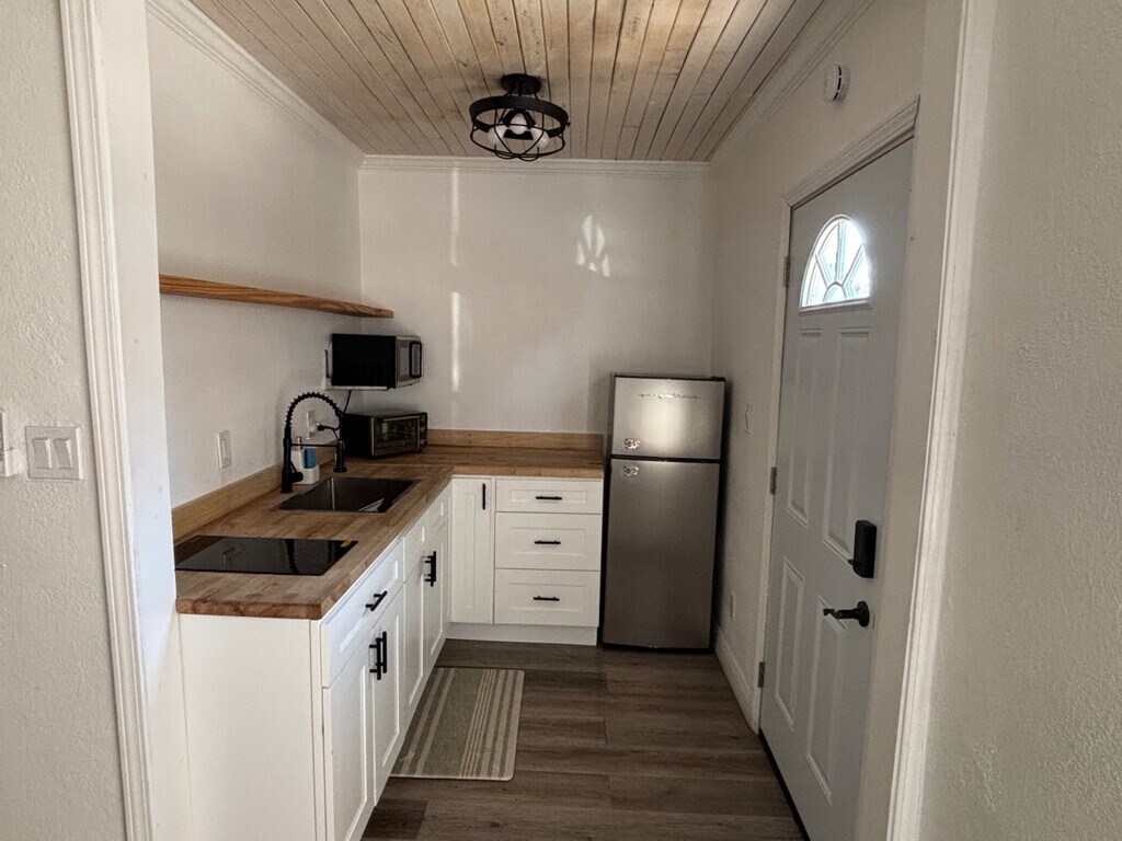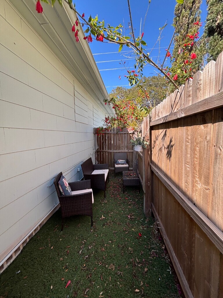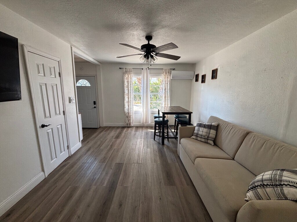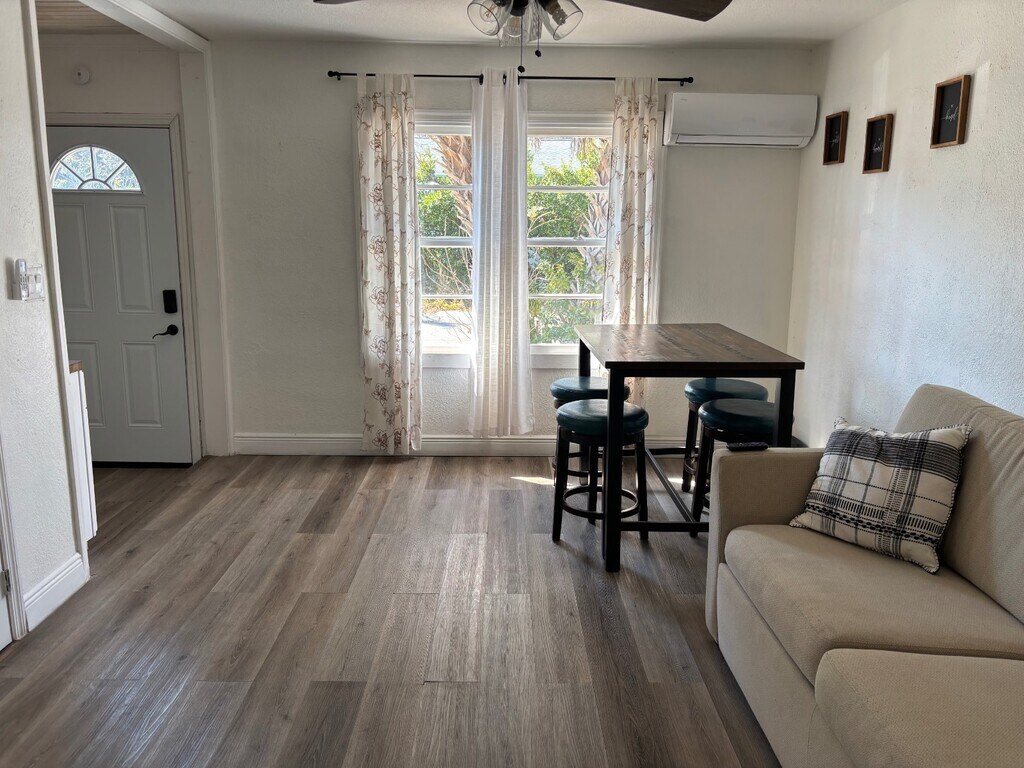 Beautifully remodeled 2 bedroom, 1 bath duplex located less than 2 miles from charming downtown Dunedin, where you can enjoy the popular farmers market, weekend live music, excellent dining, quaint shops, boat docks, and scenic Edgewater Park. This updated home features a bright and sunny living room, a kitchen equipped with a refrigerator, stovetop, and microwave, and a spacious primary bedroom with a private door leading to the backyard. The second bedroom is smaller and works well as a home office or cozy bedroom. Attractive laminate flooring runs throughout the home, and two mini-split A/C units provide efficient cooling. The fenced backyard offers space to relax or grill, and the large front carport provides convenient covered parking. Just a short drive away are the white sandy beaches of Clearwater Beach, making it easy to enjoy the coastal lifestyle and everything this vibrant area has to offer.