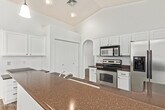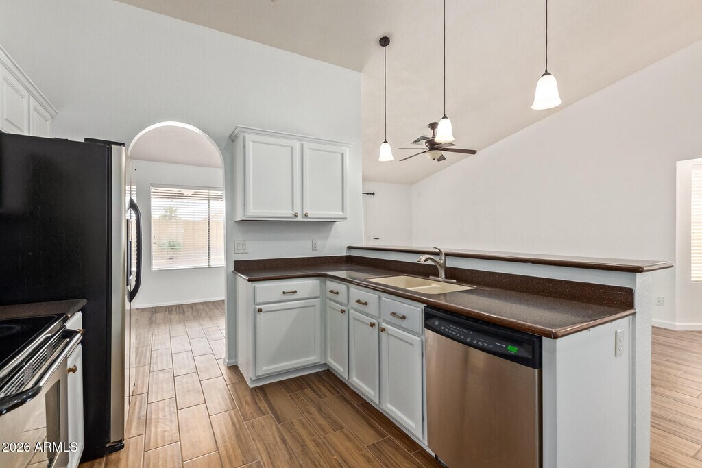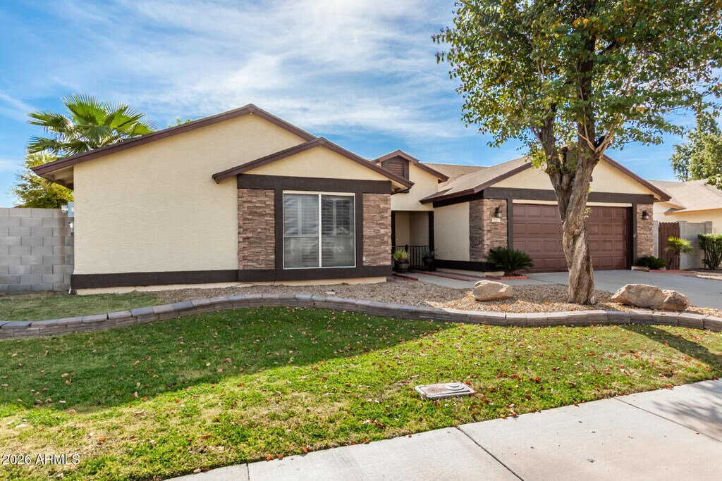 Well-appointed single-level home for rent! Upon arrival,you'll see solar panels,easy-care landscaping,stone-accented façade,& 2-car garage. Inside,the L-shaped great room features a cozy fireplace,arched doorways,vaulted ceilings,& neutral paint for a welcoming atmosphere. The family room flows seamlessly into a charming breakfast nook,perfect for casual dining! The kitchen has a breakfast bar,pantry,built-in desk,SS appliances,wood cabinetry,& Corian counters. Spacious main bedroom includes double mirrored-door closets & a private bathroom with an L-shaped dual-sink vanity. Fabulous backyard comprises a covered patio,lovely pavers,a sparkling blue pool,& a convenient storage room. This inviting rental home is one of a kind! Act now!