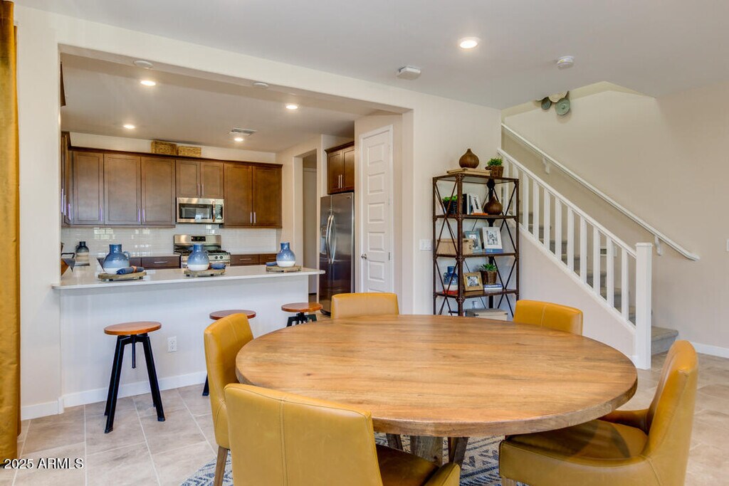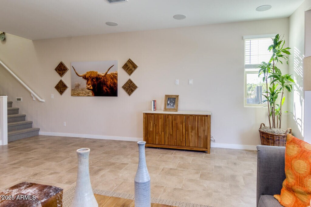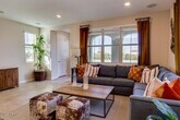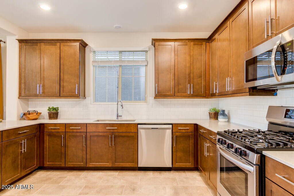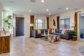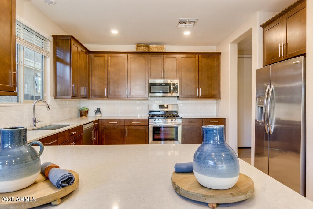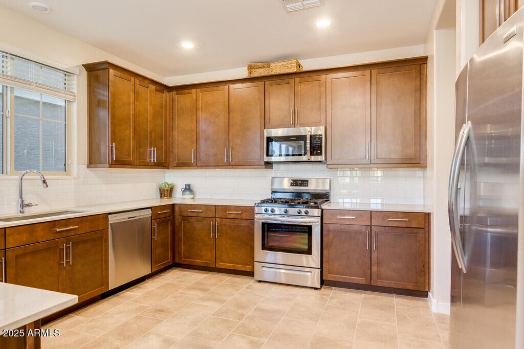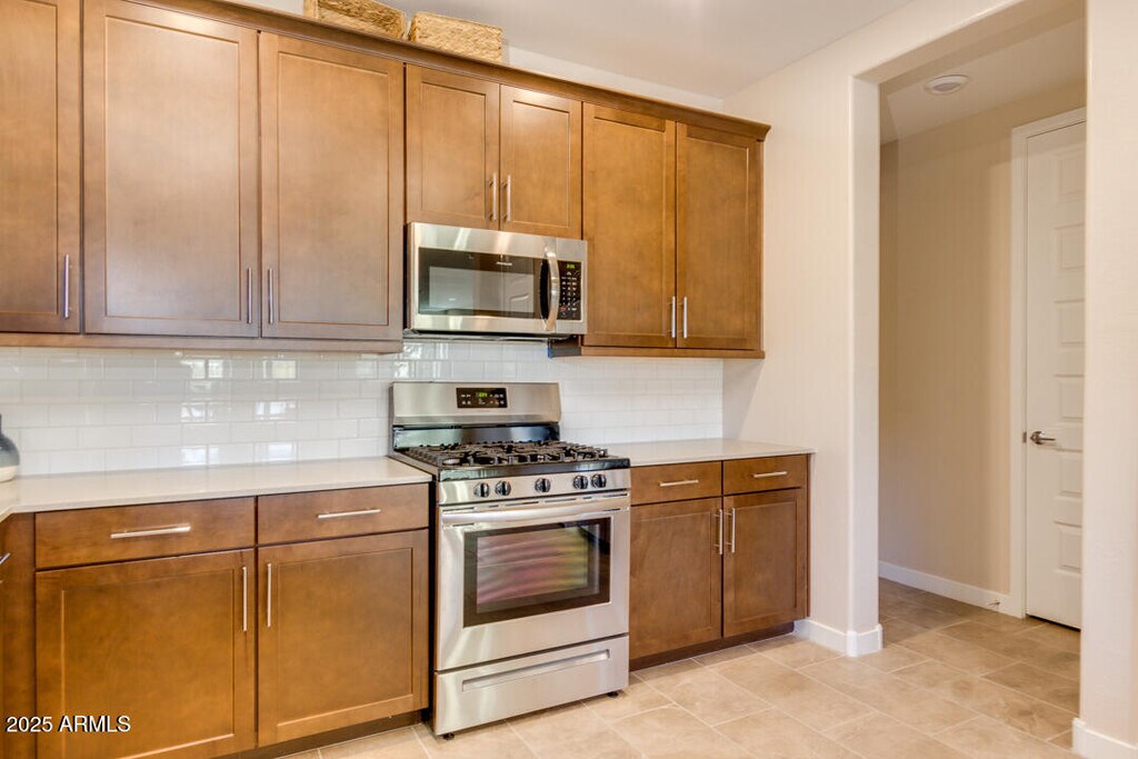 Discover this upgraded 4 bed,3.5 bath former model home in Horizon gated community w/ resort-like pool conveniently nestled right in the middle of everything. 9 ft. ceilings,extensive staggered tile flooring downstairs,in bathrooms and laundry room,complemented by upgraded carpeting upstairs. Kitchen features 42'' cabinets,quartz counters,high-quality stainless appliances,a 5-burner gas stove,a deep double sink,pantry,breakfast bar and WASHER,DRYER,FRIDGE INCLUDED. Experience the elegance of multi-panel 8 ft. interior doors and 2'' faux-wood blinds throughout. The master bedroom has a spacious closet. The master bath includes double sinks and a walk-in shower. All 4 bedrooms upstairs,great layout,cozy low maintenance yard with sitting area. Park and pool nearby. 2 car garage enters at kitchen for convenient unloading and easy access. Community near shopping,restaurants and freeway access. Home is UNFURNISHED (photos are for perspective) but has been recently repainted and is ready for new tenant.