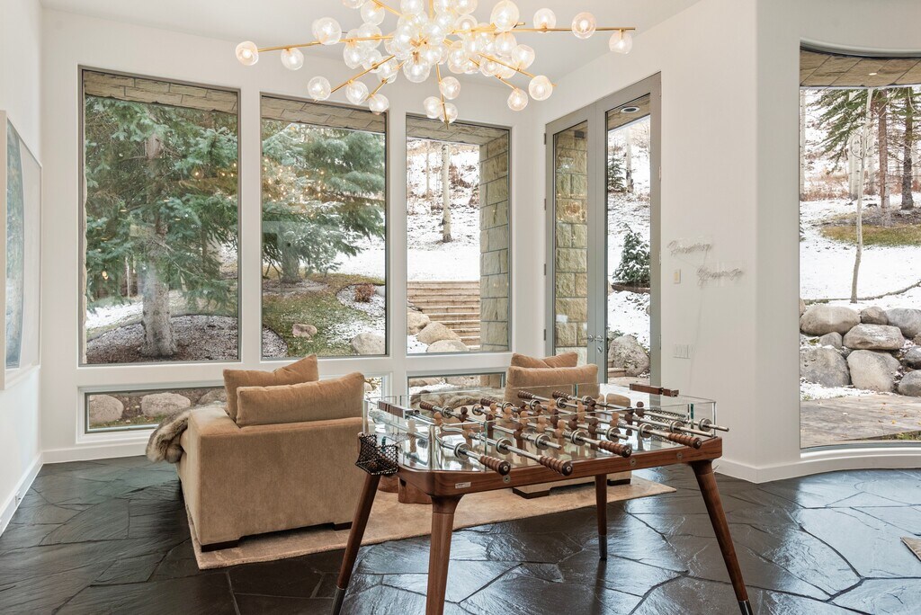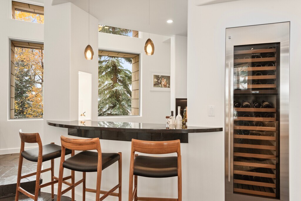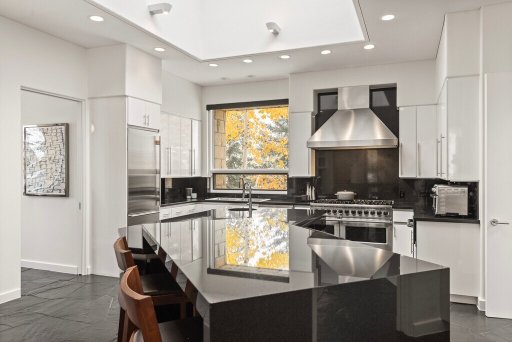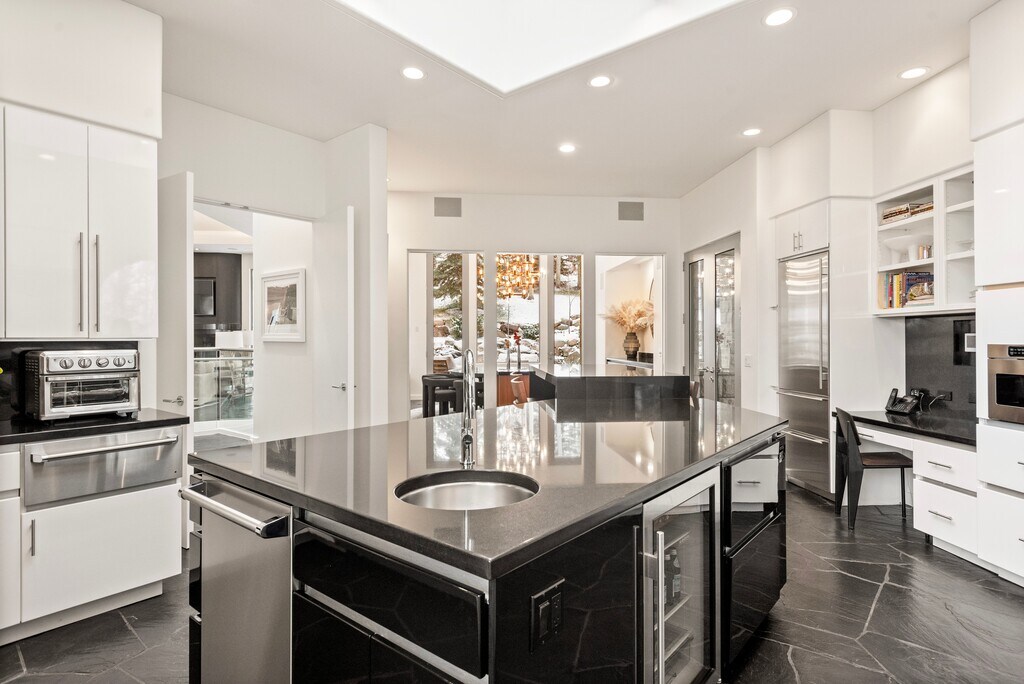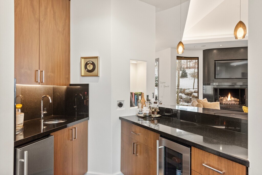 This fully renovated (2021) contemporary ski home, located directly on the Dawdler green run, offers seamless ski-in/ski-out access, making it an ideal choice for a holiday rental. The 4-bedroom, 4-full bath, and 2-half bath residence features ensuite bedrooms, three with steam showers, ensuring privacy and relaxation. High-end finishes are showcased throughout, including radiant-heated polished black slate floors, Italian chandeliers, and a gourmet kitchen with Viking appliances, an 8-burner gas range, dual dishwashers, SubZero refrigerators, and a wine cooler—perfect for entertaining. The great room, with its grand gas fireplace and dedicated bar, provides an incredible gathering space, while heated south-facing patios and a snow-melted circular driveway add convenience. An elevator from the garage to the main level and a spacious ski room with direct access to the owner's trail elevate this property's luxurious appeal, creating an unforgettable alpine experience. STR# 055960