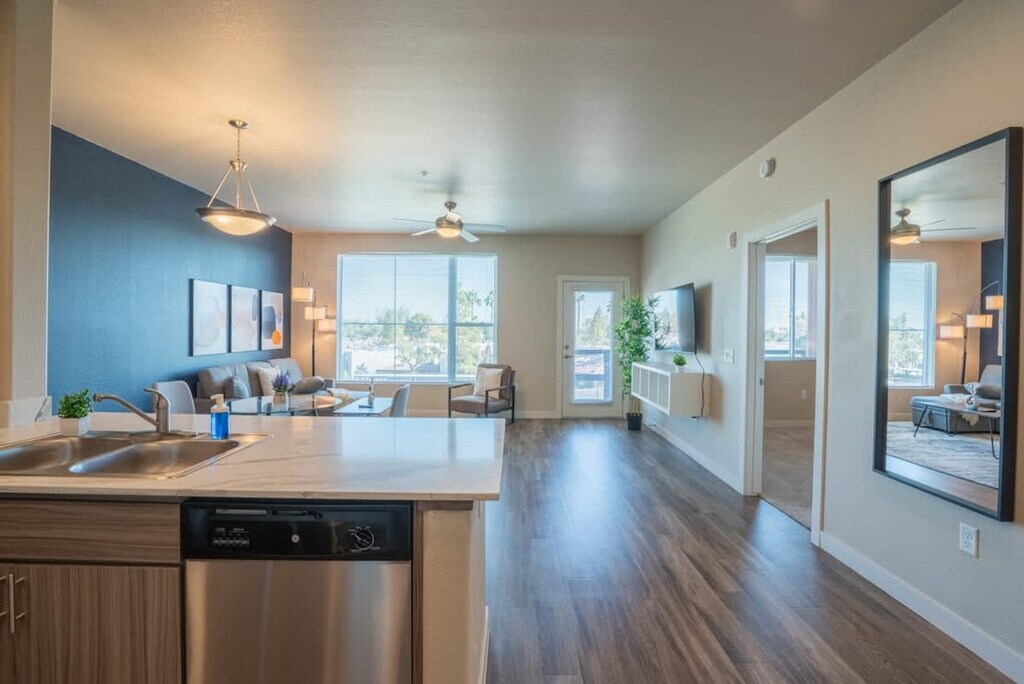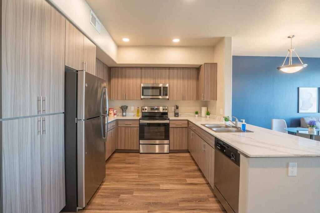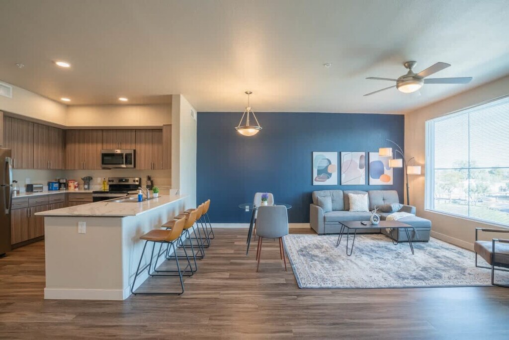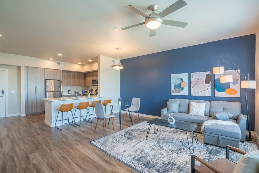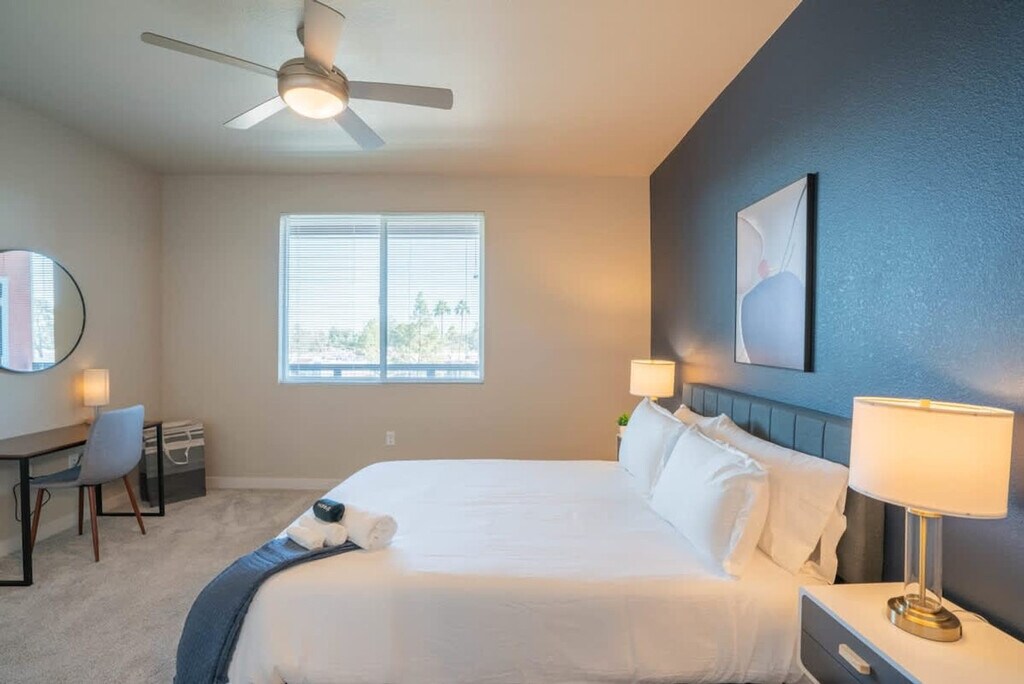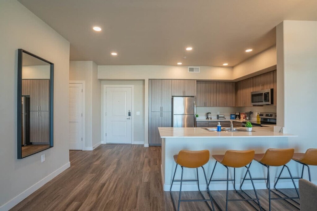 Settle into this cozy 1-bedroom apartment located in the heart of Downtown Tempe. With easy access to highly-rated restaurants, local food spots, historic places, and popular sites, everything you need is within reach. After a day of excitement, relax and rest in this wonderful space, ready for your next Tempe adventure. Relax in the innovative open-concept living space that blends the living and dining areas with the kitchen, creating a modern and sleek living experience. The living room is ideal for enjoying the company of friends and family while watching a movie or show on the 4K 55" HDR Smart TV. The fully equipped kitchen allows you to prepare your favorite meals with ease, featuring a microwave, stove, oven, refrigerator/freezer, dishwasher, toaster, coffee maker with essentials, electric kettle, and dining table with chairs. The bedroom offers a queen-size bed with pillows, linens, and sheets, along with an office desk and chair for work or study. The full bathroom is stocked with essential toiletries, ensuring you have everything you need for a comfortable stay. Parking is available on the premises with instructions provided at check-in. If you are bringing a pet, please inform us in advance. An additional cleaning fee is required per pet: $25 per night for 1-7 nights, $200 for 8-29 nights, and $300 for 30+ nights. There is a 2-pet maximum and only cats and dogs are allowed. A one-time charge of $50 per pet is required for the Pooprints program, which ensures all residents pick up after their registered pet. If a pet defecates and it is not picked up, a $500 fine per occurrence will be applied. Unauthorized pets will incur a $500 fine. Welcome to the vibrant neighborhood where the essence of Arizona living comes to life. Nestled in the heart of Tempe, this area combines local charm with modern convenience. Enjoy a leisurely stroll to nearby Mill Avenue, known for its eclectic mix of shops, cafes, and cultural hotspots. For nature enthusiasts, the nearby Kiwanis Park offers a serene escape with sprawling green spaces, lakeside trails, and recreational facilities. This neighborhood is also conveniently located near Arizona State University, making it ideal for visiting parents, prospective students, or those attending events on campus. With easy access to major transportation routes, including the nearby US-60, exploring the greater Phoenix area is a breeze. Quiet hours are between 10pm and 8am every day. Violations may result in cancellation of booking and removal from the property without refund. No parties or events are allowed, and unauthorized guests will incur a $100 fine per guest. Smoking is prohibited on the property, including balconies and around the building, with a $500 fine for violations. Noise monitors are installed to measure noise levels, and tampering with them will incur a fee. Security cameras are in the hallways for safety. Early check-in or late check-out may be accommodated at a fee of $25 per hour, with a $500 late check-out fee if not arranged in advance. Lost or unreturned keys will incur a fee of $80 for key replacements and $150 for key fob replacements. [SI]