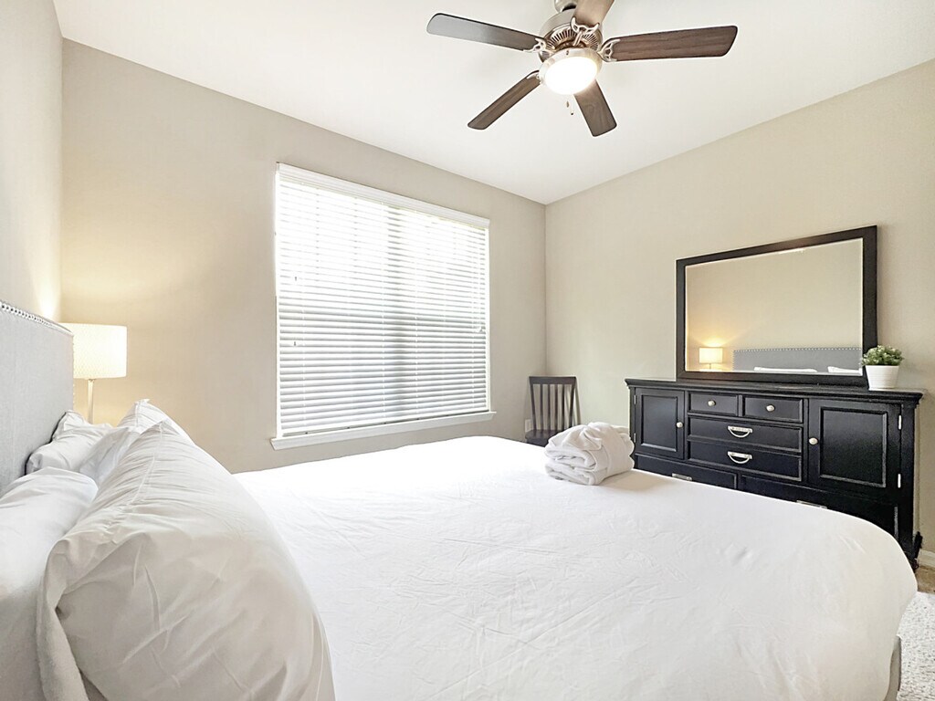 Feel at home in this tranquil 2-bedroom, 2-bath apartment located in the North Tampa/Wesley Chapel area. Situated just 5 minutes from the Tampa Premium Outlets and a 15-minute drive to USF/Moffitt Cancer Center, this fully furnished apartment is nestled in a gated community. Positioned on the 1st floor as a corner unit, it offers a quiet and private atmosphere with views of an open nature area and pool/on-site amenities. Designed with comfort in mind, this apartment includes all housewares, linens, entertainment, and utilities. The full kitchen is equipped with all necessary appliances, dishes, and cutlery, while the in-suite washer and dryer add convenience to your stay. A work desk and chair are also provided for your remote work needs. The community offers a large resort-style saltwater swimming pool, a full-size fitness center, and gated community parking. Pet-friendly accommodations are available with a $300 one-time fee per pet and a 2-pet limit, though certain breed restrictions apply. This apartment is ideally located close to parks, shopping, and great restaurants, ensuring you have everything you need within reach. Enjoy the convenience of being near major attractions while residing in a peaceful setting. Smoking of any kind, including vaping, is not allowed within the rental or within 20 feet of the building. A $1,500 fee will be charged if smoking is discovered in the rental. Check-in is between 4:00 PM and 8:00 PM, and guests must notify 24 hours in advance if checking in after 6 PM. Background screening is required for every adult aged 18 and over, and must be completed 48 hours prior to check-in. Maintenance follows a service route each day and cannot be scheduled. Pets must be secured during maintenance visits. The apartment features a work desk and chair, complemented by lightning-fast Wi-Fi, making it remote work-friendly. [SI]