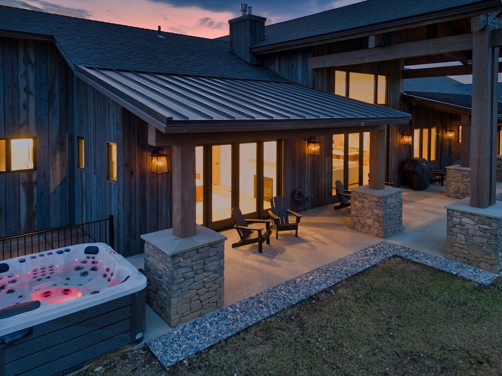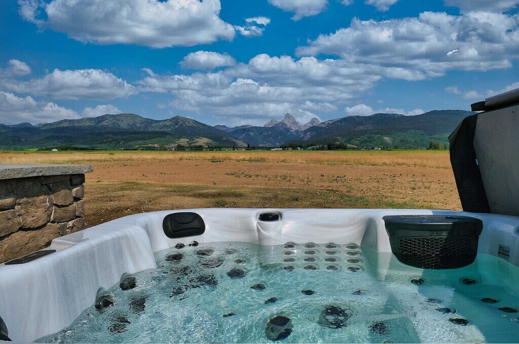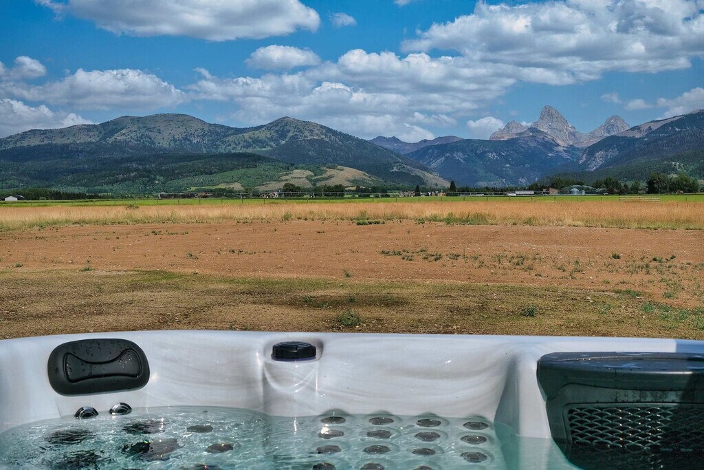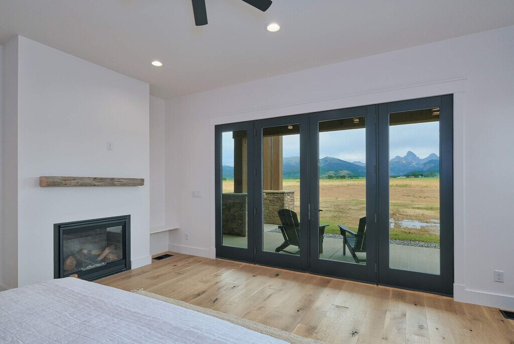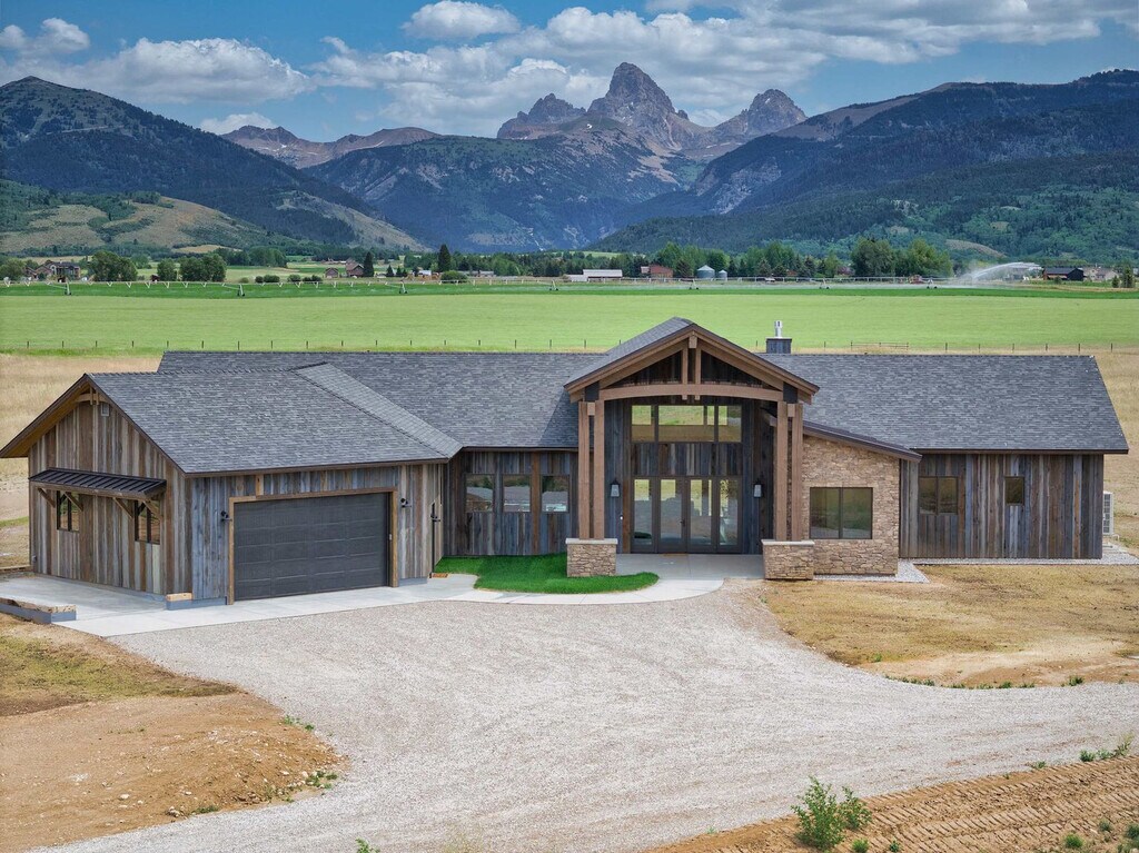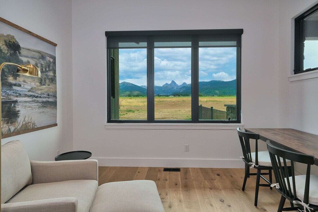 Welcome to a modern mountain retreat in Teton Valley, offering panoramic views of the Grand Tetons. This luxurious 6-bedroom, 4.5-bathroom home spans over 5,500 sq ft and is situated on a private 6-acre lot. Enjoy seamless indoor-outdoor living just 20 minutes from Grand Targhee Resort and 45 minutes from Jackson Hole. This newly built home in Driggs, Idaho, combines modern design with rustic elegance, providing unforgettable views of the Grand Tetons from nearly every room. The spacious layout is perfect for gatherings, featuring a vaulted great room with floor-to-ceiling windows and a cozy gas fireplace. The fully equipped chef’s kitchen is ideal for creating memorable meals. After a day of adventure, unwind in the private hot tub with panoramic views or enjoy a movie night in the home theater with a 4K projector and 120” retractable screen. The home accommodates up to 12 guests across 6 spacious bedrooms and 4.5 bathrooms, including a master suite with a king bed, fireplace, and ensuite with a soaking tub. The property offers ample driveway parking and a garage space. Enjoy the covered front and back patios with seating and a gas grill for BBQ nights. Located in the scenic Teton Valley, Driggs is a peaceful mountain town known for its wide-open landscapes and friendly community. Just 45 minutes from Jackson Hole and surrounded by rivers, trails, and national parks, Driggs offers the perfect balance of nature, privacy, and small-town charm. The home is situated on a quiet 6-acre lot just outside the town center, surrounded by rolling fields and wildlife, yet only 10 minutes from downtown Driggs where you’ll find local coffee shops, farm-to-table restaurants, grocery stores, and art galleries. Outdoor enthusiasts will find paradise here, with Grand Targhee Resort just 20 minutes away for skiing, hiking, and biking, and the Teton River and nearby national forests offering world-class fly fishing and horseback riding. The property does not permit pets or smoking of any kind. Quiet hours are from 8:00 PM to 8:00 AM, and fireworks are not allowed. The maximum number of guests cannot exceed 12. There is a strict no events policy, with violations resulting in a $2,500 fine and immediate cancellation of your reservation. Exterior lights should be turned off at night to preserve the dark sky environment. A maximum of four licensed vehicles are allowed in the driveway, and no recreational vehicles are permitted on the property. The home includes an office with Teton views, perfect for remote work. It features Wi-Fi-controlled heating and cooling zones for comfort during work hours. [SI]