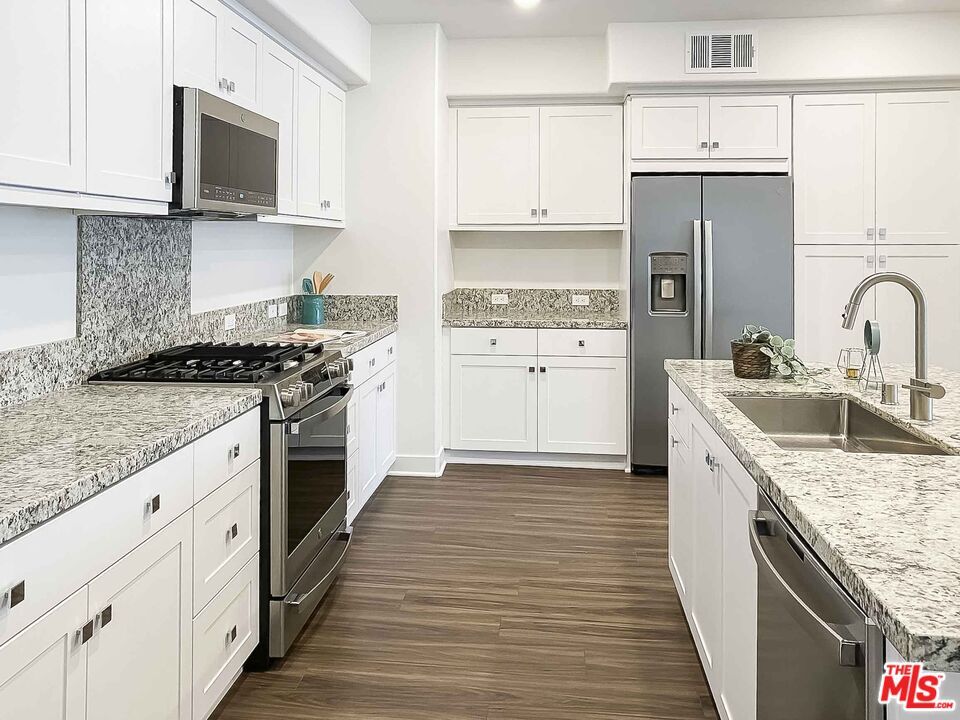 Top floor unit in the newer luxury condominium Alia at A Town," located in the heart of Anaheim's Platinum Triangle. The open living layout features stylish finishes, a gourmet kitchen with an extra large center island, ample cabinet space, recessed lights in the kitchen and living room, and a spacious balcony accessible from the living room. The primary suite offers a generously sized bedroom, an en suite bath with dual sinks, and a large walk-in closet with built in shelving. All appliances are newer, including stainless steel stove, refrigerator, dishwasher, microwave, central air and heat, washer, and dryer in the unit. Two private parking spaces are included in the garage, and the building offers secure entry with key fob access. Community amenities feature a beautifully maintained resort style pool surrounded by modern lounge seating and shaded cabanas, along with a barbecue area that is perfect for entertaining friends and family. The property is close to Angel Stadium, the train station, Disneyland, Old Towne Orange, outlet shopping, Chapman University, hospitals, restaurants, and stores. Available to show on 12/2, so please make an appointment for a showing." MLS# 25619577