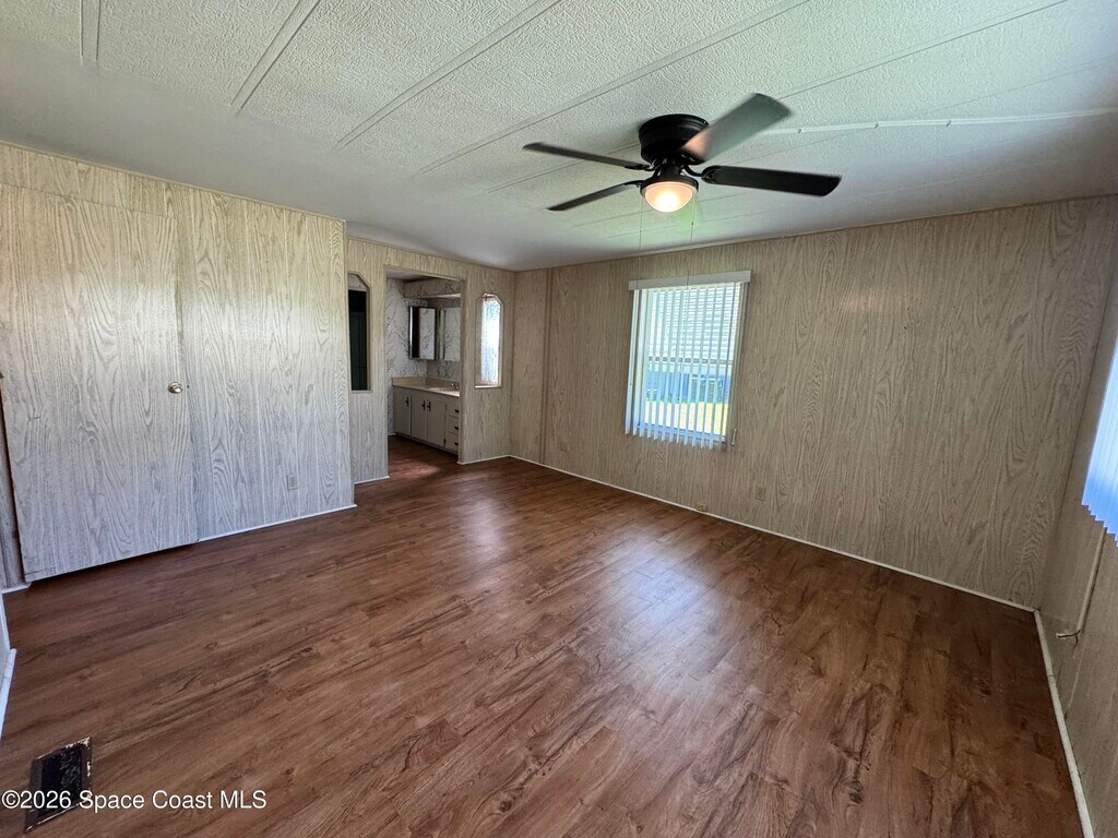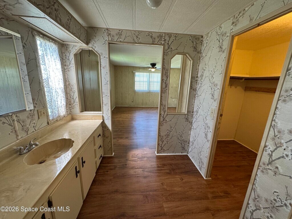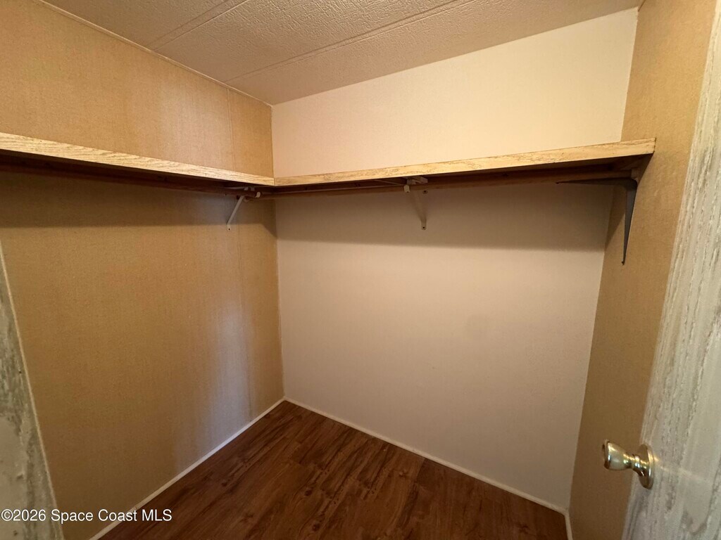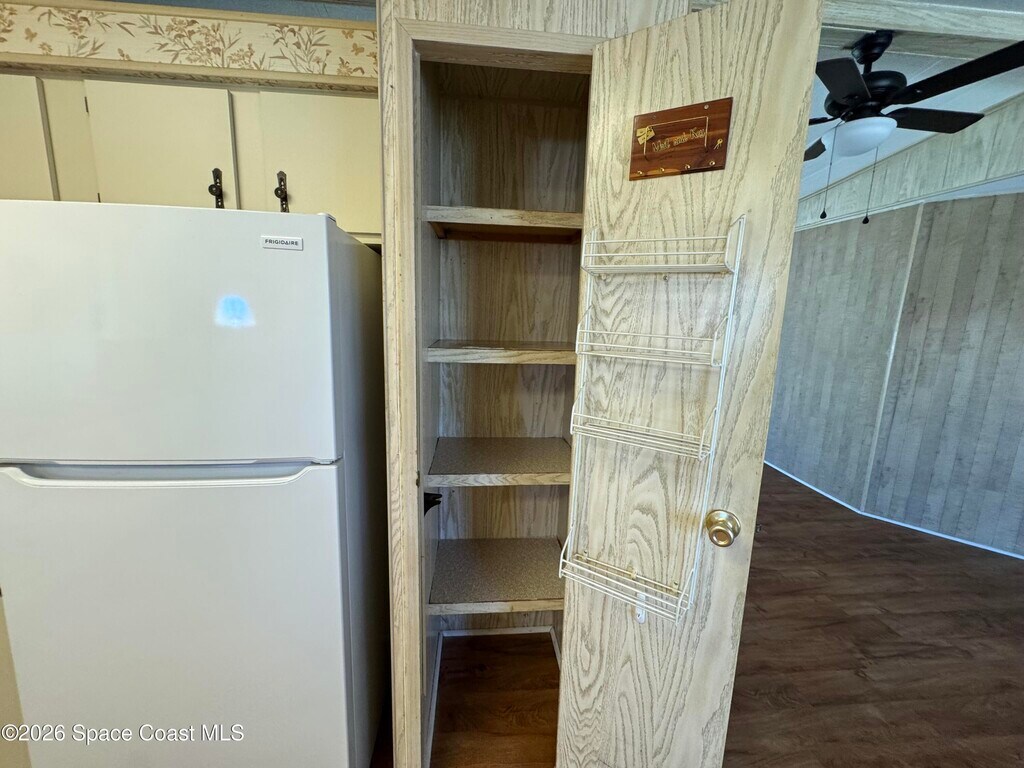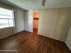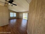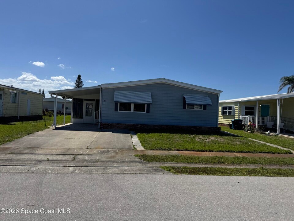 Welcome to an active lifestyle in this 55+ community. This is a spacious two bedroom two bathroom home in Palm Bay Colony. Walk-in closets and ceiling fans in both bedrooms. Primary bedroom is equipped with it's own bathroom. Newer kitchen appliances including the refrigerator,stove,and microwave. Built-in cabinets in dining room. Wood look floors and window treatments throughout. Additional storage attached to the large screened porch.. Additional storage outside. Large driveway with covered carport for parking.. Lot is in an excellent location being only 100 feet from amenities including a clubhouse,swimming pool,lounge area,tennis court,pickleball courts,shuffleboard court,grills,and car wash area. Community has sidewalks and bike paths for your convenience. MLS # 1074877