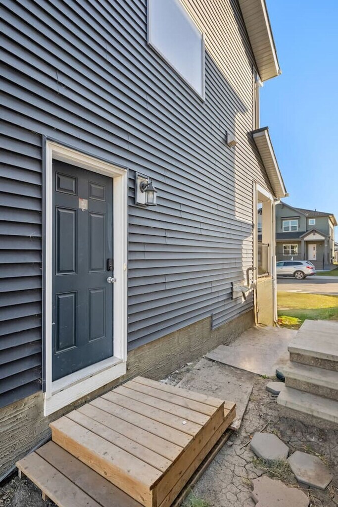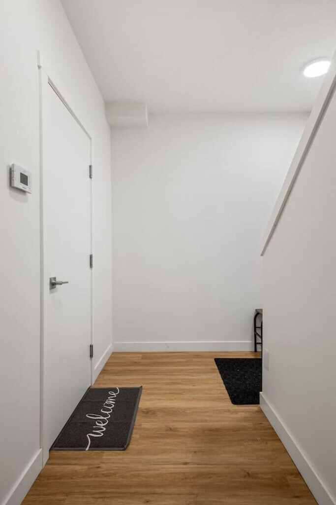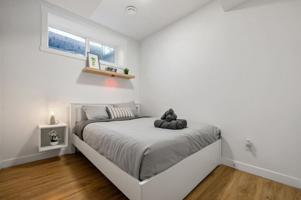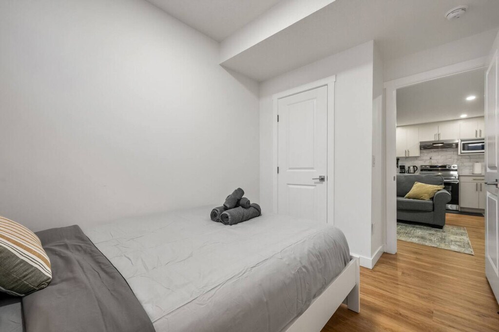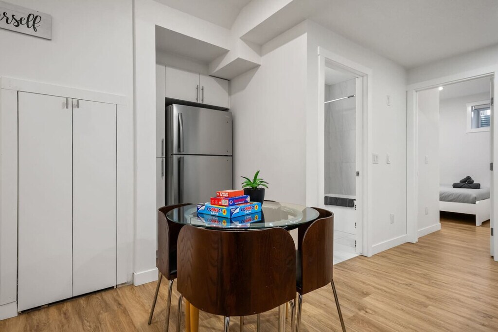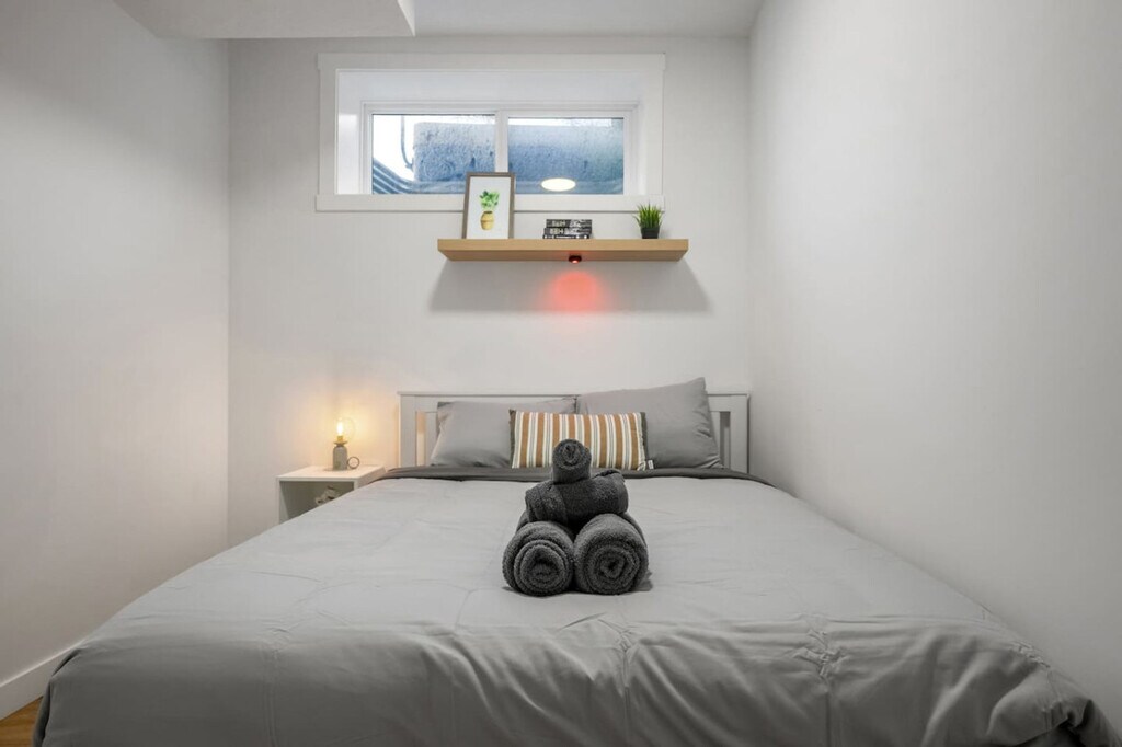 Minutes away from the Calgary Airport, this 2-bedroom basement suite offers a private entrance and non-shared space, ensuring comfort and safety. Feel at home with a cozy living room featuring a 50" Smart TV with Netflix, and a fully equipped kitchen. The suite includes two bedrooms with queen beds, a full-size 4-piece bathroom, central heating, and free street parking. The living room is inviting with a comfortable sofa and high-speed internet, perfect for relaxation. The kitchen boasts stainless steel and custom appliances, including a 4-burner stove, oven, microwave, refrigerator, freezer, and dishwasher with pods provided. Enjoy complimentary drip coffee, tea, and Brita water. The dining area is equipped with a table and chairs, making it ideal for meals. Optional upgrades include a National Park Entry, Welcome Basket, Birthday Decor Package, Romantic Wine and Flower Package, Spa at Home Package, Movie Night Upgrade, Christmas Tree and Decor, Halloween Decor and Pumpkin Carving Package, Winter Cozy Package, Beer Tasting Kit, Diffuser and Aroma Set, Additional Bedding and Sleeping Arrangements, Grocery Pre-Stocking Service, and Pet Friendly Package, subject to availability. Located just 1 minute from Cornerstone Marketplace for grocery, dining, and daily essentials, and 5 minutes to Stoney Trail for seamless city access. The suite is 11 minutes from Calgary International Airport and close to attractions like Genesis Centre, Prairie Winds Park, and CrossIron Mills. Quick access to major roads makes trips to Banff and Kananaskis a breeze. This is a basement suite, and while a peaceful stay is prioritized, there may be some noise from potential upstairs tenants. The property has a strict no-smoking, no-vaping, and no-parties policy, with a $250 CAD fine for smoking violations. Quiet hours are from 10 pm to 7 am. Unauthorized late check-out will result in additional fees. The suite is professionally managed with 24/7 guest support and communication, ensuring a smooth stay. Includes an office work area, high-speed Wi-Fi, and a comfortable set-up for remote work. [SI]