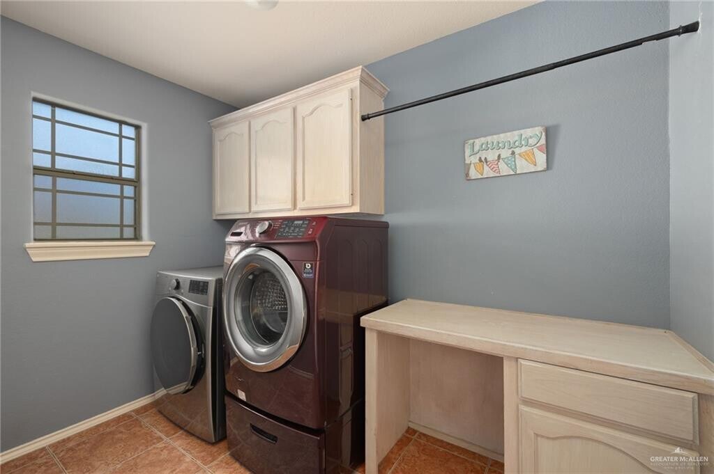 Spacious 3 bedroom,2.5 bathroom located in Mission,TX. Enjoy the oversized living room,a separate formal living room and dining room,perfect for gatherings.The kitchen offers ample counter space,a breakfast bar,and a full appliance package. Primary suite includes a jacuzzi tub,large walk-in shower,and double vanities. Secondary bedrooms offer plenty of space for family or guests. Large laundry room (washer & dryer included) with built-in desk. Outside,enjoy a private fenced backyard with a covered patio and storage building. Lawn care included. Zoned to Sharyland ISD.