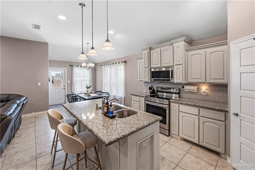 Welcome to this beautifully cared-for 4-bedroom,2-bath home in one of Edinburg’s most convenient areas. Located just 2 minutes from the expressway,this move-in-ready home offers a spacious open layout with a large living room,soaring ceilings,abundant natural light,and a stunning kitchen complete with granite countertops and a center island perfect for gathering. The private primary suite features a spacious layout and double-sink vanity,while the additional bedrooms provide versatility for a growing family,guests,or workspace needs. Enjoy the fenced backyard with space for outdoor fun and entertaining. Situated within walking distance to IDEA and only minutes from UTRGV,the Edinburg Courthouse,DHR Hospitals,shopping,and dining,this home combines location,comfort,and everyday convenience.