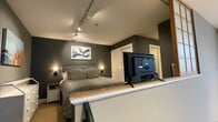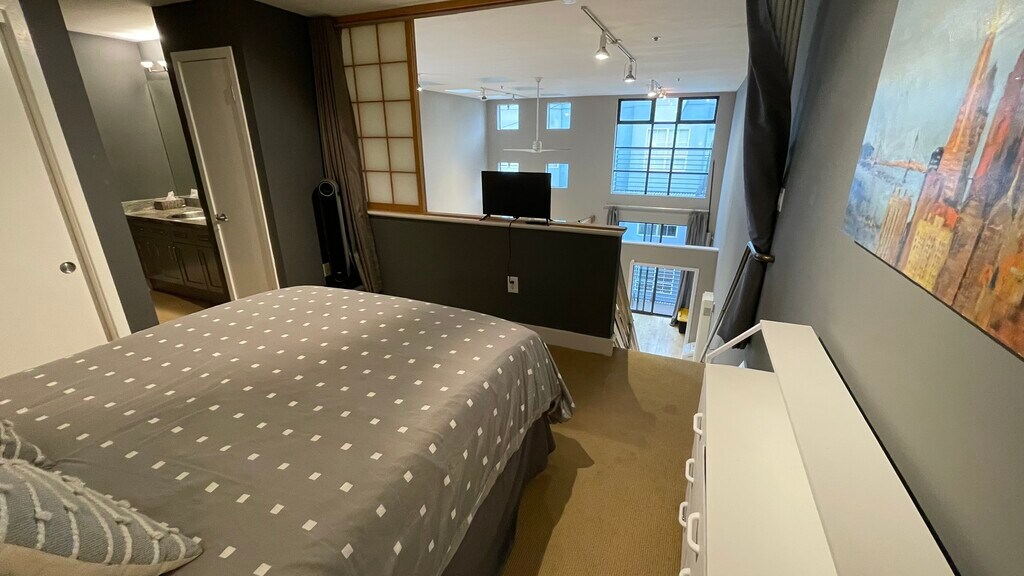 Delivered Fully Furnished. Experience loft living elevated. Nestled on the top, rear floor of a Sternberg Benjamin Architects-designed building, this one-bedroom, one-and-a-half-bath SOMA residence is a triumph of light and line. The dual-level layout features dramatic, double-height ceilings that amplify the generous proportions. The lower level is dedicated to modern function, showcasing a stainless steel kitchen with a gas range, an open great room for living and dining, a versatile den, a guest half-bath, and a secluded private balcony. Ascend to the lofted upper level, where the primary suite enjoys an aerial perspective of the space below. Complete with two closets, a custom movable shoji screen, and a full en-suite bath, it's a true retreat. Convenience is key with an in-unit laundry, deeded parking, and simple rooftop access. Located at 190 7th Street, you're perfectly positioned in dynamic Soma West, just steps from Whole Foods, Cellermaker Brewery, and Sightglass Coffee.