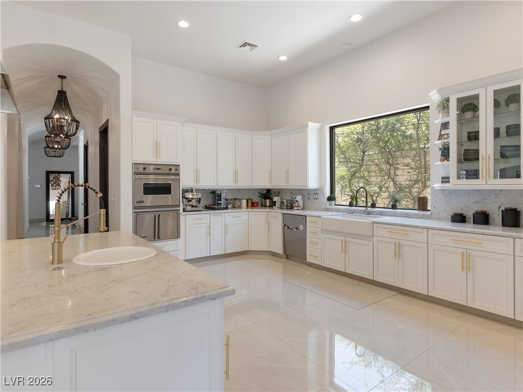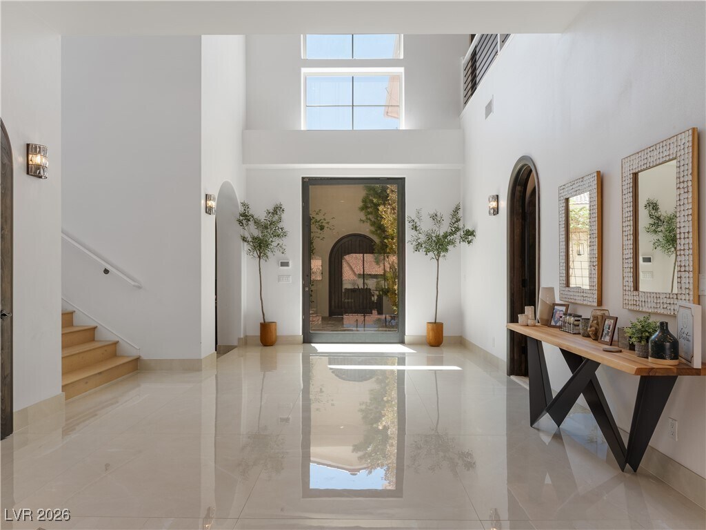 Step into unparalleled elegance with this Modern Mediterranean, a sanctuary of luxury and style. A private, ivy-lined courtyard welcomes you to a grand foyer, leading into a stunning 40-foot-high masterpiece. The villa features soaring floor-to-ceiling windows that surround a romantic piano room, perfect for intimate gatherings or serene moments. A big, fabulous, bright, and open kitchen is equipped w/commercial-grade Viking appliances and flows directly into the great room with glass walls over looking the pool deck! The regal Primary Suite offers, sitting room, oversized closets, steam shower & resort-style spa providing relaxation while overlooking a backyard oasis. 4 spacious bedrooms - 7 meticulously designed baths - Separate Casita/Gym - 4 Car Garage - This home embodies sophistication and comfort. Experience casual luxury living in a home that redefines elegance and refinement, in a beautiful guard gated neighborhood in Henderson, named the #2 Safest Large City in the America!