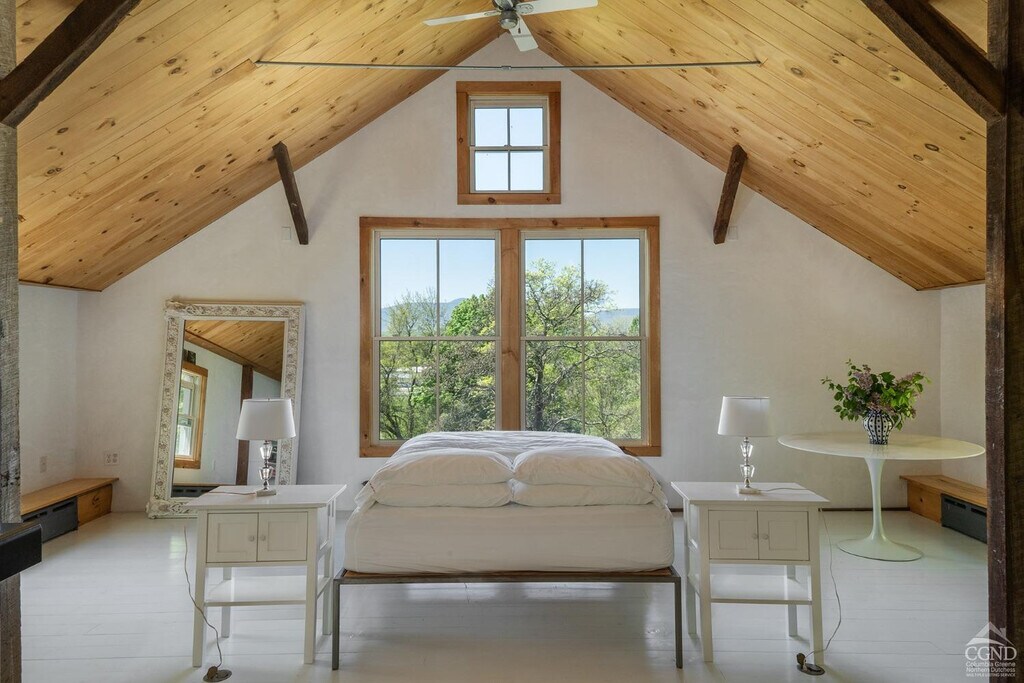 Firefly BarnA secret refuge in the heart of Germantown. No car needed,just a short walk to Otto's,the wine store,florist and the Universal Cafe & Bar. The residence sits at the end of a long driveway; it is a stunning renovation of a vintage barn with plaster walls and extraordinary views of the Catskill Mountains. The ground floor has two lovely bedrooms and a full bath. The main floor has a kitchen,dining room and living room with breathtaking views and on the third floor is a divine principal suite. Incredible light,cozy warm,central air,screened-in porch and lovely garden. A truly enchanting place to spend your summer and winter; close to regional skiing,ice skating in Palestine park and a great hill,on the property,for sleigh riding.