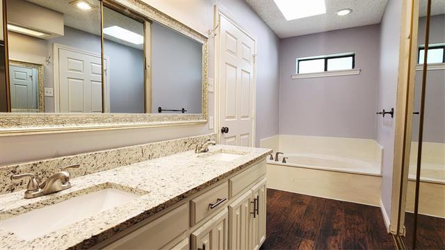 This beautifully updated 3-bedroom, 2-bathroom home in Carrollton, TX, offers a perfect blend of modern upgrades and classic charm. The residence sits on a large corner lot, providing ample outdoor space and privacy. Inside, you will find a freshly painted and crisp interior that creates a clean and welcoming atmosphere. The spacious living room features a cozy fireplace, perfect for gathering with family or friends. The heart of the home is the stunning, remodeled kitchen, which showcases updated appliances, elegant granite countertops, and a large skylight that bathes the space in natural light. The primary bedroom is a serene retreat with a generously sized walk-in closet and a luxurious en-suite bathroom featuring dual vanities, a separate glass-enclosed shower, and a soaking tub. This home is ready for you to move in and enjoy its many desirable features.