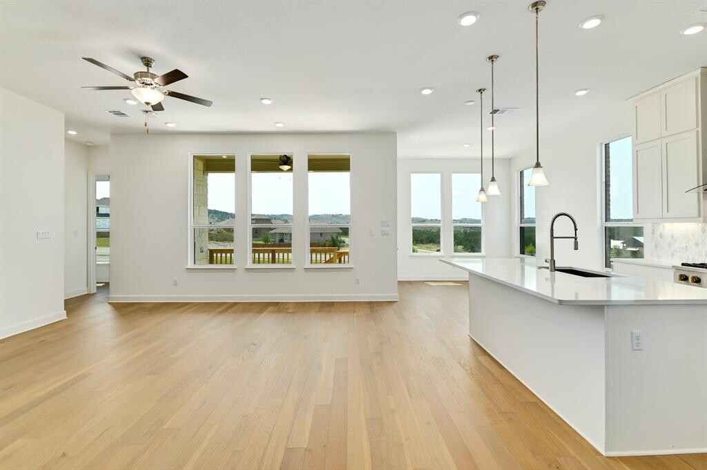 Experience breathtaking, unobstructed Hill Country views from this beautiful 2021-built residence in the highly desirable Sweetwater community. This modern-style home features an open floor plan with expansive windows and abundant natural light. This immaculate 4-bedroom, 4-bathroom smart home includes a Samsung refrigerator and washer/dryer, along with app-controlled features such as the stove, microwave, front door lock, Ring doorbell, and irrigation system. Step inside to discover soaring ceilings, rich hardwood flooring spans the entire first floor, and a seamless open-concept layout. The chef’s kitchen boasts white cabinetry, quartz countertops, a center island, and an upgraded 6-burner gas cooktop—perfect for entertaining. The main level offers three bedrooms and bathrooms, including the primary suite with a window seat. The spa-like bath features dual vanities, an oversized walk-in shower with dual showerheads, niches, and a sitting area. One bedroom includes a private bath and walk-in closet, ideal for multi-generational living or guests. Another bedroom features a two-story ceiling and walk-in closet. Upstairs, a large flexible space offers endless possibilities for a home office, media room, or entertainment area. Enjoy two patios, one with a cozy fireplace. Storage is available under the staircase and in the oversized two-car garage. Sweetwater offers resort-style living with clubhouses, pools, mini-golf, sports courts, tennis, basketball, trails, and scenic Hill Country views—all within Lake Travis ISD. Owner-Agent MLS ID 9046613