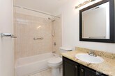 This freshly painted first-floor end-unit DELMAR model,the largest one-bedroom floor plan,is ideally located in a quiet setting with open space to the side and rear. The kitchen features granite countertops,a ceramic tile backsplash,newer dishwasher,ceramic cooktop range,and a newer refrigerator. Laminate flooring runs throughout,and recent updates include a newer HVAC system and newer hot water heater. The spacious primary bedroom offers a large walk-in closet,and the generously sized bathroom includes a tub/shower and vanity. The home also features a newer washer and dryer. Residents enjoy community amenities including a pool,tennis courts,volleyball court,and playground,all conveniently located near shopping,bus,and train transportation.