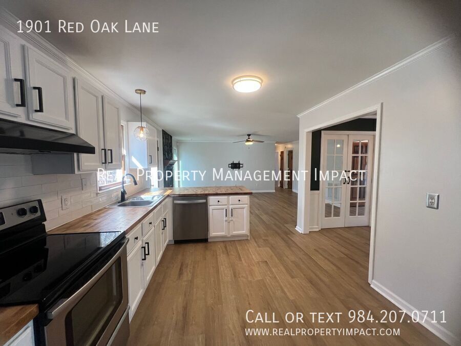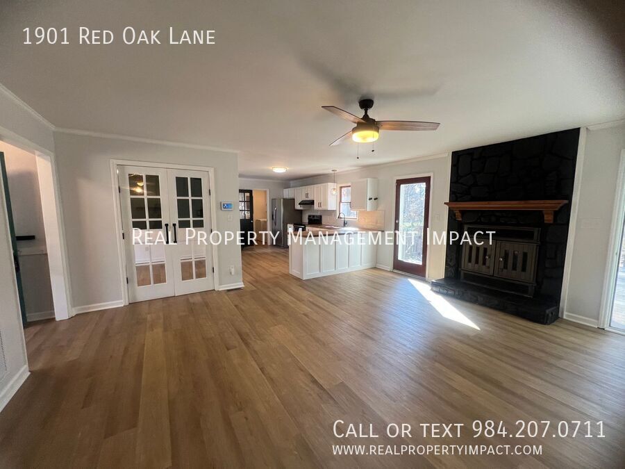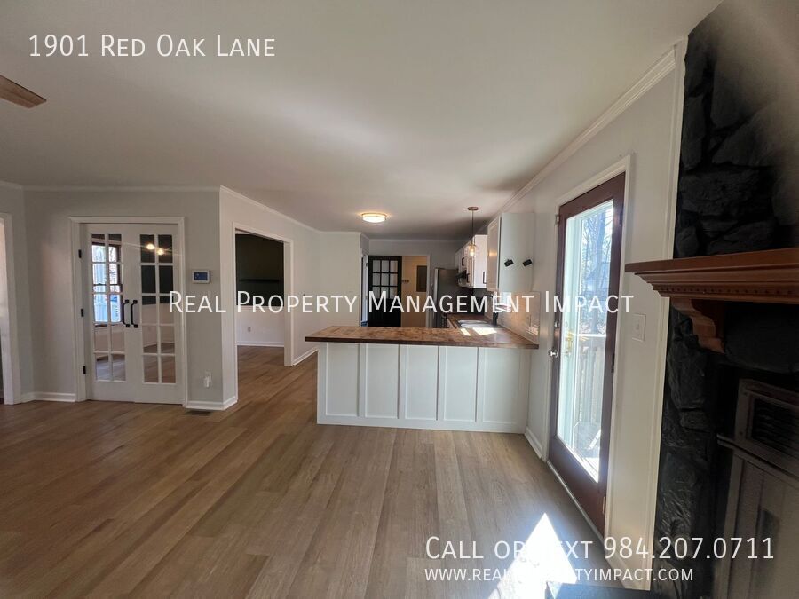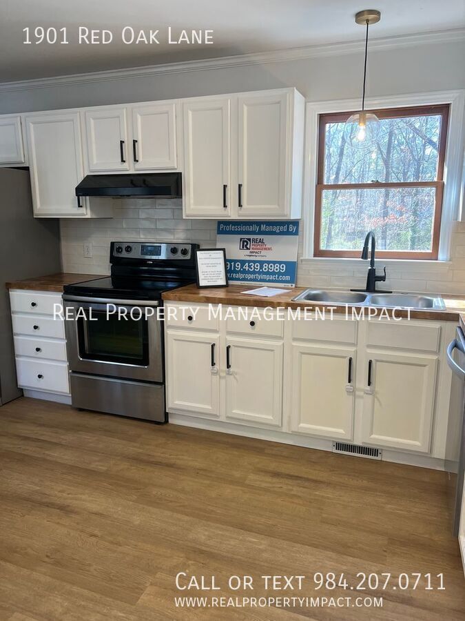 Nestled on a quiet cul-de-sac with a long gravel driveway and tree-lined streets, this beautifully updated one-level ranch blends timeless charm with modern farmhouse style throughout. A covered front porch welcomes you home, while a convenient side entry connects directly to the kitchen and laundry room—perfect for busy lifestyles. The heart of the home is a generous, thoughtfully updated kitchen featuring butcher block countertops, white shaker cabinets with black hardware, subway tile backsplash, stainless steel appliances, and a large entertaining peninsula. A window over the sink frames peaceful backyard views while modern pendant lighting sets the perfect ambiance. The open-concept layout flows seamlessly into the warm and inviting living room, anchored by a stunning painted stone wood-burning fireplace. Entertain effortlessly on the expansive back deck overlooking a private, tree-lined yard. A separate dining room with painted accent walls, modern chandelier, and French doors adds elegance and character. Wood-style flooring, fresh paint, brand new windows, and abundant natural light complete this move-in ready gem. The primary suite overlooks the serene backyard with an updated vanity bath, while two additional bedrooms share a beautifully refreshed hall bathroom. A detached two-car garage and pocket-door laundry room with built-in shelving add everyday convenience. Perfectly positioned between Clayton and Garner near Highway 70—a growing area offering peaceful living with easy access to everything! This one won't last! Schedule your showing today. Application Criteria • Credit Score – Min 600 (soft pull) • Income (monthly) –3X Monthly Rent • Everyone over 18 must apply ($55 application fee applies to all applicants) • No Evictions • Criminal Background Screened • If pets are allowed – separate pet screening is required. Fees applied once approved. • All information provided on the application is screened and verified. • Approval timeline varies based on the verification process. Average = 48 hours. AVOID RENTAL SCAMS: Real Property Management Impact is a licensed Real Estate Agency that exclusively markets and represents this listing. We do not advertise on Craigslist or Personal FB Pages. We would never ask you to wire money, request funds through a payment app for initial rent, deposits, or take the key after your showing to move-in. Washer/Dryer