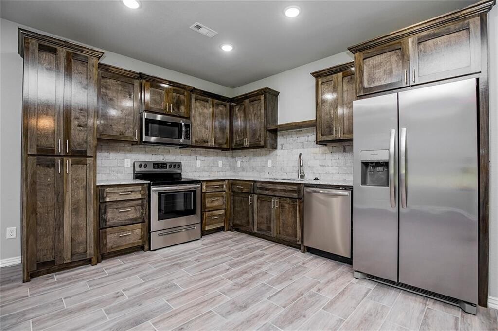New Construction Tri-Plex in Siloam Springs. 3 bedrooms 2.5 baths. Main living area has vinyl plank wood style flooring through main living area, carpet in bedrooms. Kitchen features granite counters and stainless appliances, includes refrigerator, over range microwave and pantry. 1/2 bath on main level. 3 bedroom and 2 full baths upstairs. Also included washer and dryer. Fenced yard. MLS# 1335963