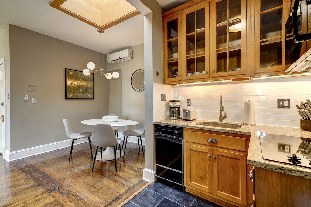 Feel at home in this charming, spacious 1-bedroom apartment located in the heart of Dupont Circle on the top floor of a three-story walk-up. Freshly painted, this top floor gem has double windows in both the living room and bedroom. The updated kitchen includes brand new granite counters and backsplash, plus a brand new refrigerator and an efficient all-in-one convection microwave oven. Enjoy original hardwood throughout, a wall-to-wall custom clothing cabinet in the large bedroom, an in-unit washer/dryer, and a skylight. One large assigned storage closet is available in the basement, and common area bike storage is available. The apartment is just two blocks from the Dupont Circle Metro and steps from Connecticut Avenue, with all your favorite retailers and restaurants. Dupont Circle is a traffic circle, neighborhood, and historic district in Northwest Washington, D.C., bounded approximately by 15th Street NW to the east, 22nd Street NW to the west, M Street NW to the south, and Florida Avenue NW to the north. Mini-split systems are in place. [SI]