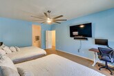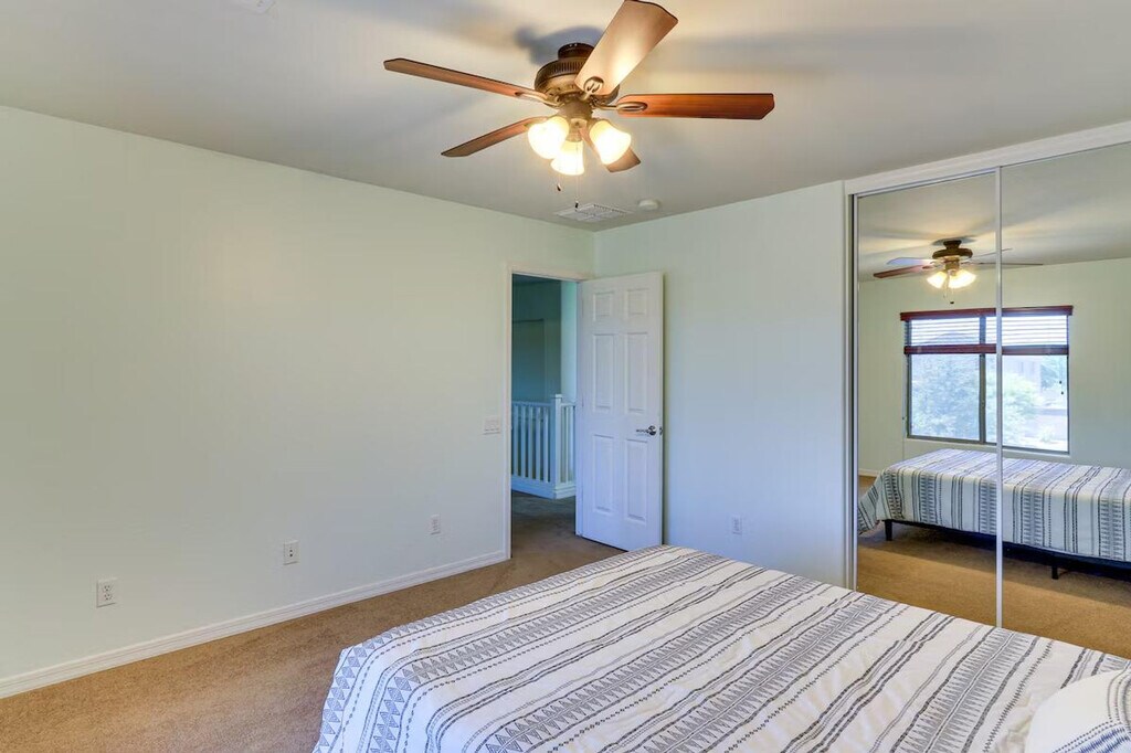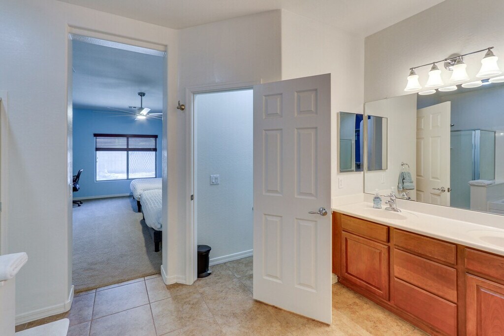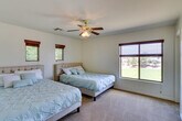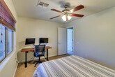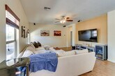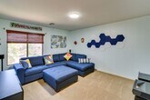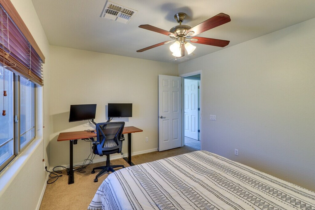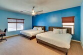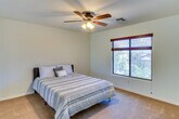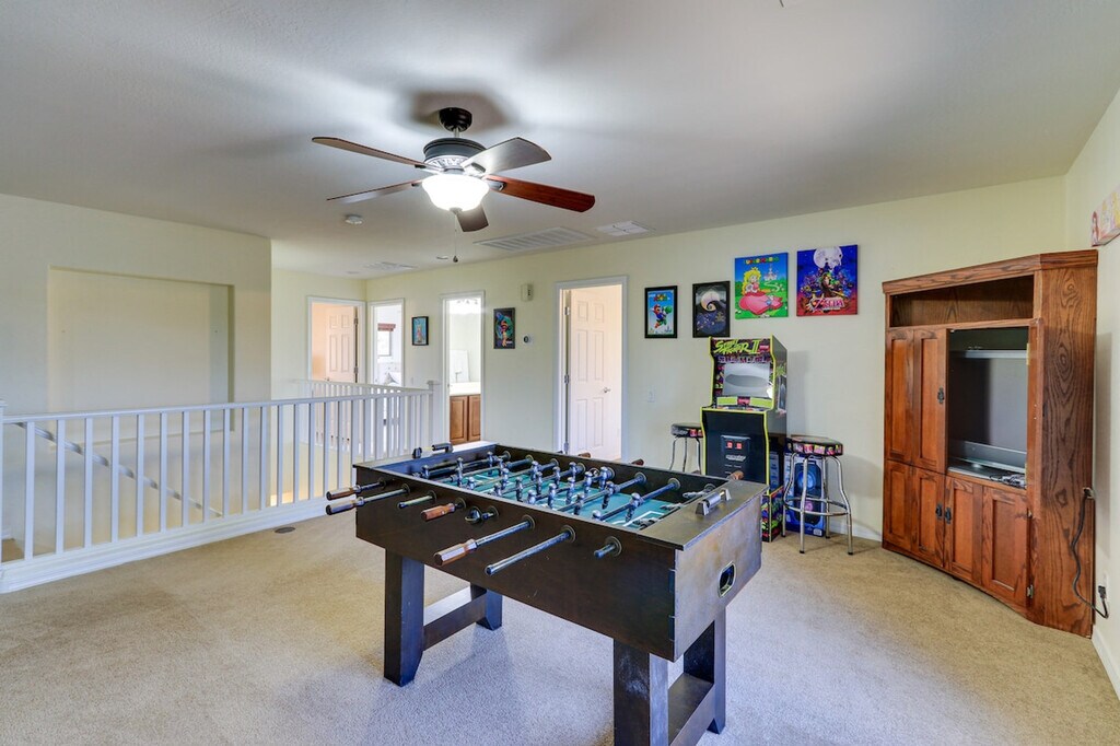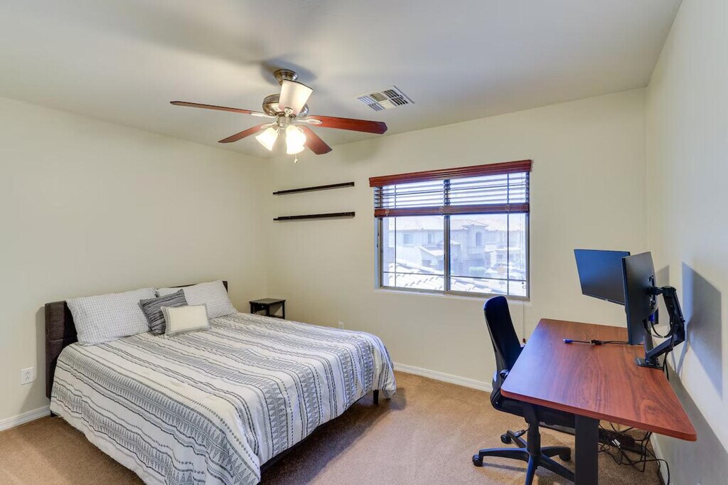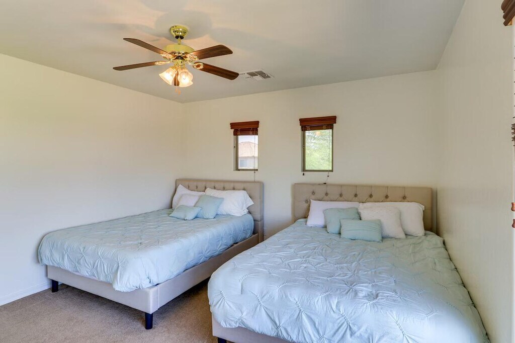 Feel at home in this breezy 5-bedroom, 3.5-bath Maricopa vacation rental. This 2-story house is brimming with amenities for all ages. This house features a private, heated pool, game room, home theater, and 3 Smart TVs. The outdoor living space includes a covered patio with a gas grill, dining area, and lounge seating, plus a private backyard patio with a hammock, lounge chairs, beach towels, and an umbrella. Inside, you'll find a home theater with a CinemaX laser projector, a game room with a foosball table, arcade game, TV with PlayStation video game console, and air hockey table, a dining table, and a treadmill. The fully equipped kitchen includes a dishwasher, refrigerator, oven, 4-burner stovetop, microwave, breakfast bar with seating, Crockpot, drip coffee maker, toaster, toaster oven, cooking basics, dishware, and flatware. Additional amenities include free Wi-Fi, keyless entry, central heating and A/C, ceiling fans, a washer/dryer, linens/towels, and laundry detergent. There is an optional pool heat fee of $15/night (plus fees and taxes, paid pre-trip, applied to the entire stay). Hikers can take in the landscape of South Mountain Park and Preserve, golf enthusiasts can tee up at Ak-Chin Southern Dunes Golf Club, animal lovers can make new friends at the Phoenix Zoo, and thrill-seekers can fly through the sky with Skydive Phoenix. Smoking, pets, events, parties, and large gatherings are not allowed. Your safety matters. This property features 3 exterior security cameras. Camera 1 faces the front outdoor entry. Camera 2 faces the driveway. Camera 3 is in the backyard and faces the pool. The cameras are outward facing and do not look into interior spaces. The cameras record video and sound when activated by motion and will be on during the duration of your stay. Includes 2 desks with monitors and a mini fridge. [SI]