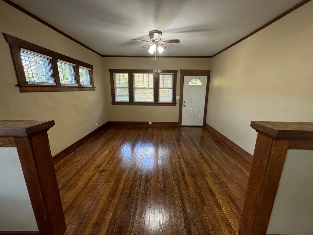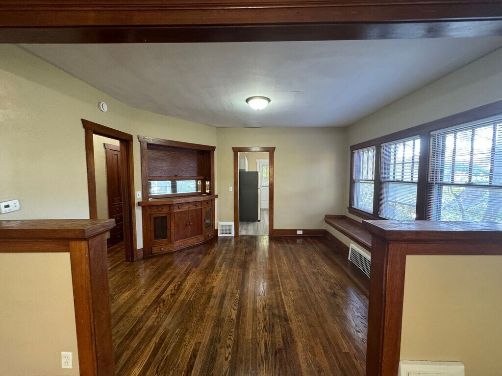 This 5 bedroom, 1 bathroom home offers a practical layout with a mix of updated finishes and original character. The main level includes 2 bedrooms with hardwood flooring, while the upper level has 3 carpeted bedrooms. There are wooden built-ins throughout and a combination of hardwood, carpet, and luxury vinyl plank flooring. The kitchen includes a stove, dishwasher, and refrigerator. There is a large unfinished basement with multiple rooms that provide plenty of storage space as well as laundry hookups. Includes central air conditioning. Located on a hill with some separation from neighboring homes, the property also features a one-car garage with a tunnel connecting the basement to the kitchen, making it convenient for bringing in groceries. There is a fenced backyard and a covered front porch. Please submit a request to view the property and include your contact information. Pre-screening questions will be sent via text prior to scheduling a showing. To move in, first month’s rent and the following deposits are required: Security deposit: $1650 Water deposit: $200