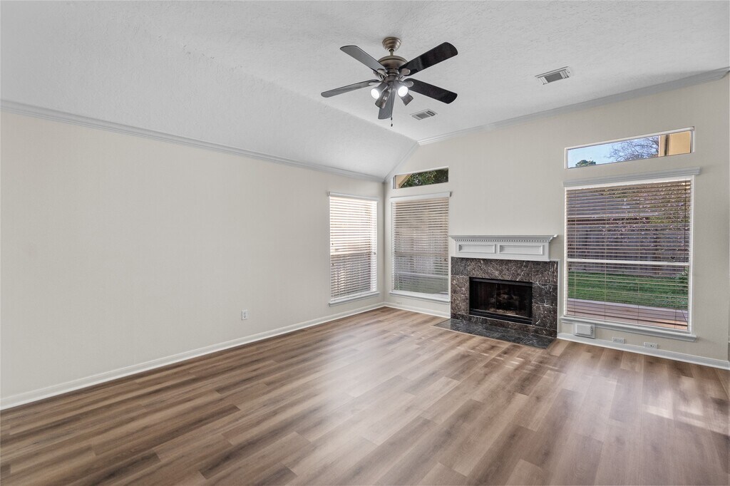Charming one level brick home offering 3 bedrooms and 2 baths. As you enter,you are welcomed by tile flooring,high ceilings,and a formal sitting and dining combo. Toward the back of the home,the living area features laminate wood flooring and a cozy gas fireplace. The kitchen overlooks the living space and includes wood cabinetry,granite counters,stainless steel appliances,a gas oven,breakfast bar,and an adjacent breakfast area. The spacious primary bedroom showcases beautiful curved windows and an en suite bath with a vanity area,double sinks,a jetted tub,and a glass enclosed shower. There are two additional bedrooms and one featuring built ins. These bedrooms share a full bath with double sinks and a tub shower combo. The backyard is fully fenced and includes a patio,perfect for relaxing or entertaining. Residents also enjoy access to HOA amenities including a pool,playground,basketball hardcourt,and tennis court. MLS# 62527924