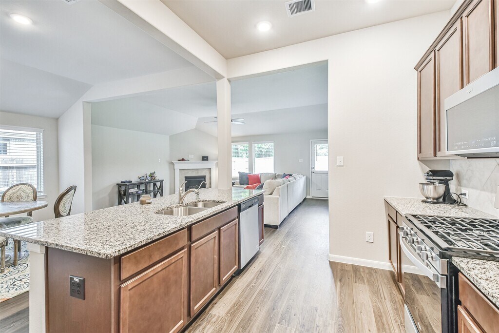 This wonderful 2021 Beazer home in the coveted Amira subdivision is just what you've been looking for! Sit outside on your covered front porch and enjoy the park across the street. Entertain in the spacious family room with a gas fireplace,open to the large dining area and island kitchen. Cook your favorite meals in this bright,beautiful kitchen with gas range,granite countertops,lots of cabinets,breakfast bar,walk-in pantry,and upscale refrigerator. Relax in your generous primary suite,with double sinks,soaking tub,shower,and large walk-in closet. Two secondary bedrooms and another full bath are separate from the primary suite. Mud area and laundry room,complete with washer and dryer,are conveniently off the 2 car garage entrance. This home has wood-look flooring throughout the main living areas,blinds on all the windows,and no back neighbors. Amira offers a resort style pool,fitness room,multiple parks,lakes,and walking trails. Come see this lovely home today! MLS# 78745273