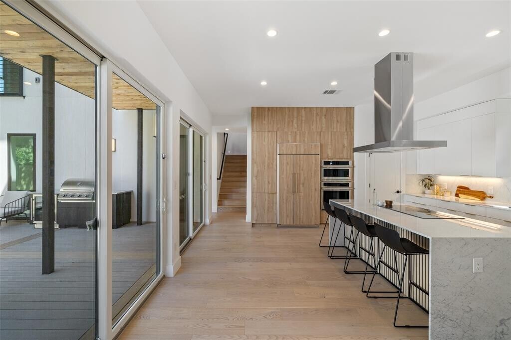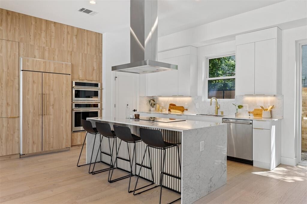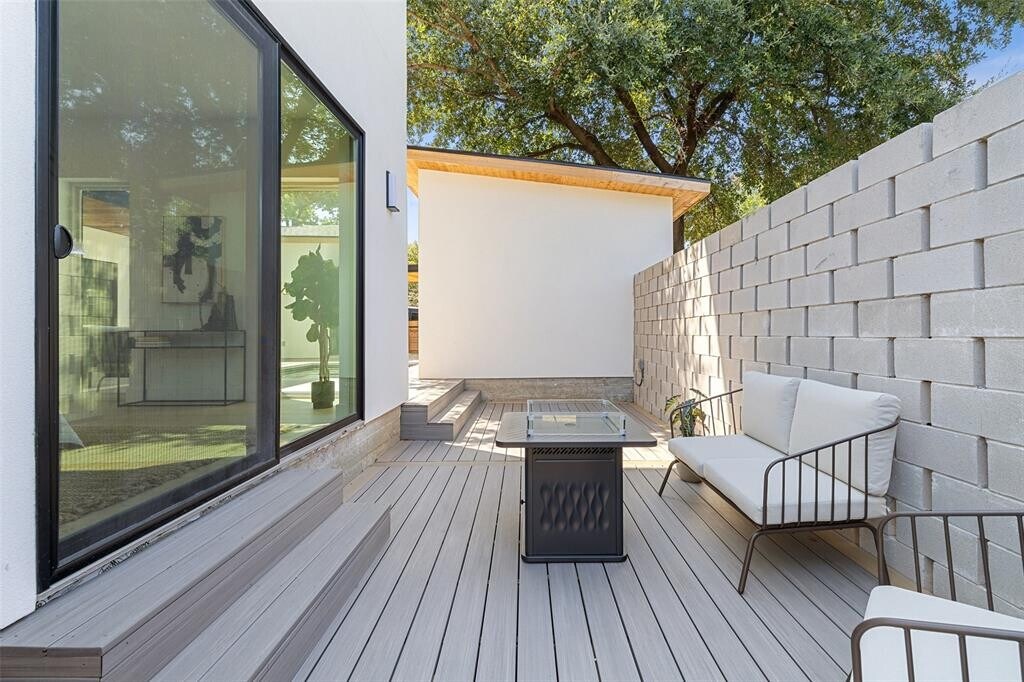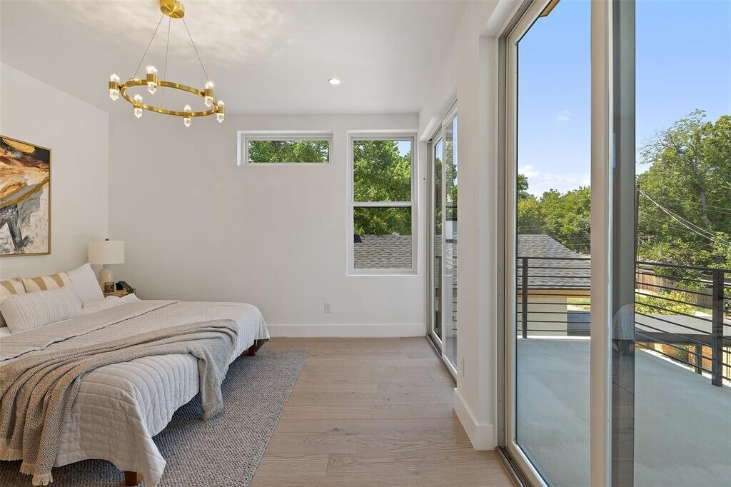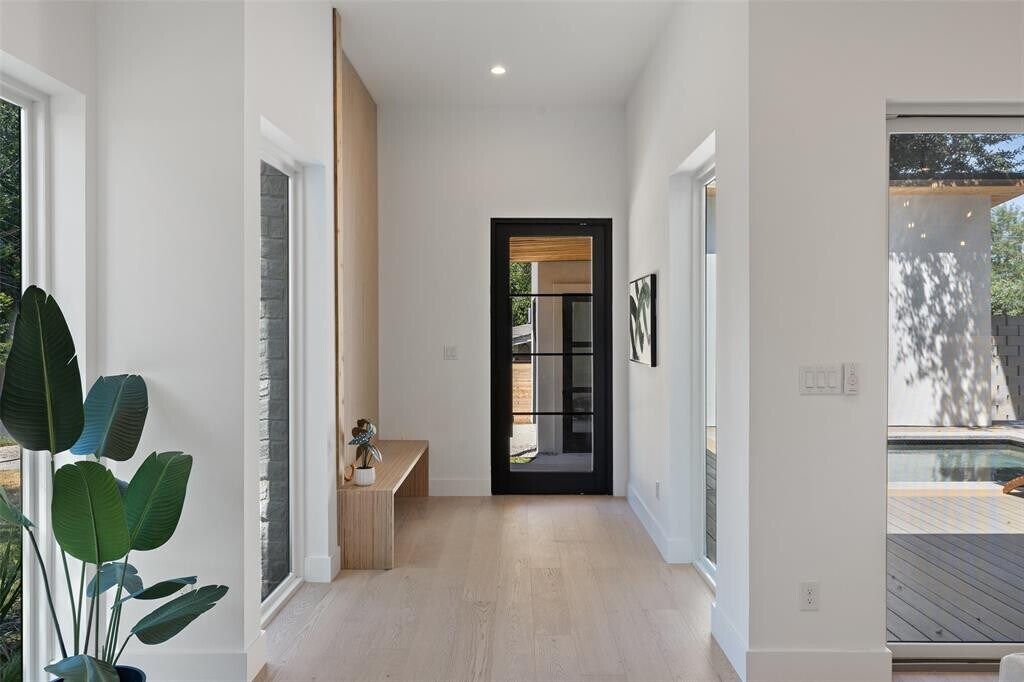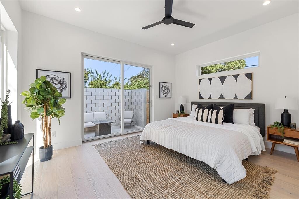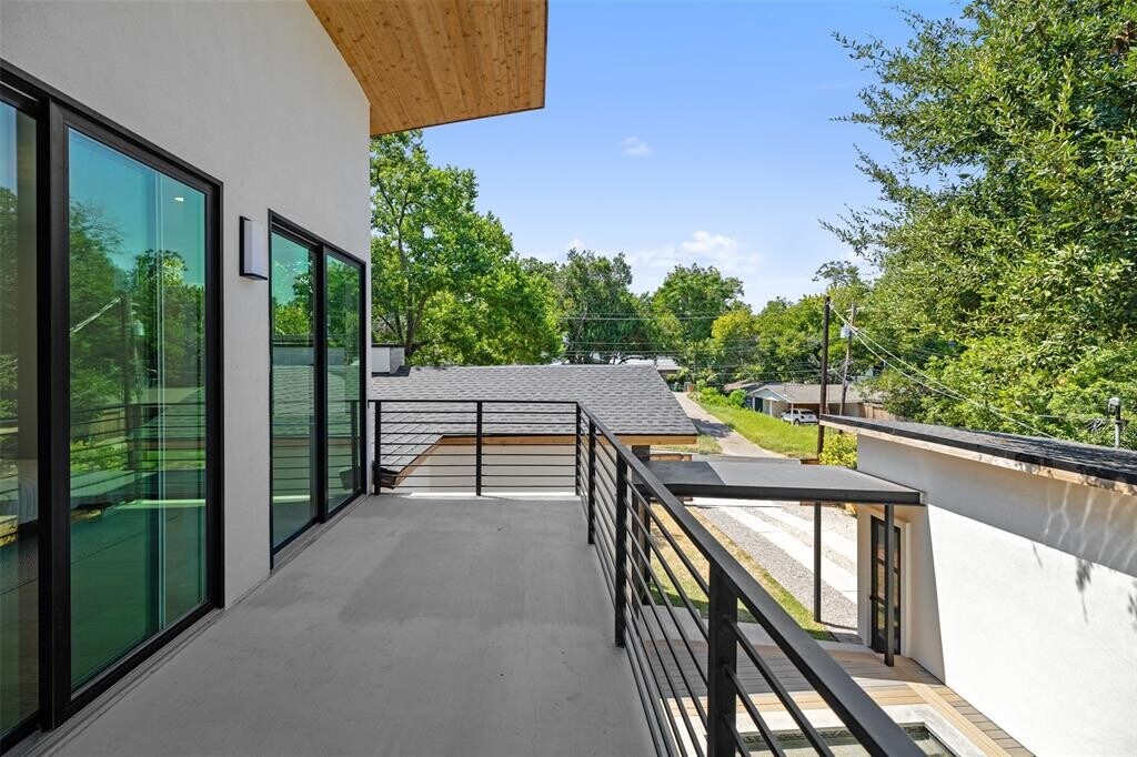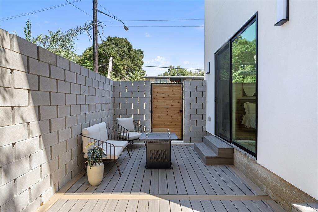 A contemporary compound in Austin’s sought-after Travis Heights neighborhood, this home offers a truly unique and luxurious living experience. Private patios & balconies create personal retreats for everyone in the home while a stunning central courtyard offers a pristine pool, outdoor, kitchen, and ample patio space for al fresco dining, entertaining, and relaxing. The layout effortlessly blends indoor and outdoor living, making this home not just a place to live but a private oasis where you can unwind, entertain, and enjoy the best that modern luxury has to offer. A breezeway leads from the 1-car garage to the front door. Inside, the open floor plan features thoughtfully crafted details including wood accents, wide-plank wood flooring, and pendant lighting. Large windows and sliding glass doors bathe the space in natural light while a modern fireplace warms the living room. The kitchen is a culinary haven boasting a built-in cooktop & oven, an integrated refrigerator, a walk-in pantry, and a center island with a waterfall quartz countertop. A bedroom on the main floor is perfect for guests, featuring a private patio and an ensuite bath with a double vanity and a California walk-in closet and large shower. Upstairs, the primary bedroom is a luxurious retreat. Sliding doors lead to a large private balcony, ideal for enjoying your morning coffee. The spa-like ensuite bath features a double vanity and walk-in shower while the California walk-in closet offers ample space for your belongings. The two additional bedrooms upstairs are generously sized and share a spacious bathroom. Fully fenced in & gated, the backyard and front yard offer lush landscaping and a private and tranquil space to garden, relax, and play. Beyond your front door, a mix of eclectic boutiques, designer brands, and some of Austin’s best restaurants converge on Austin’s beloved South Congress Avenue.