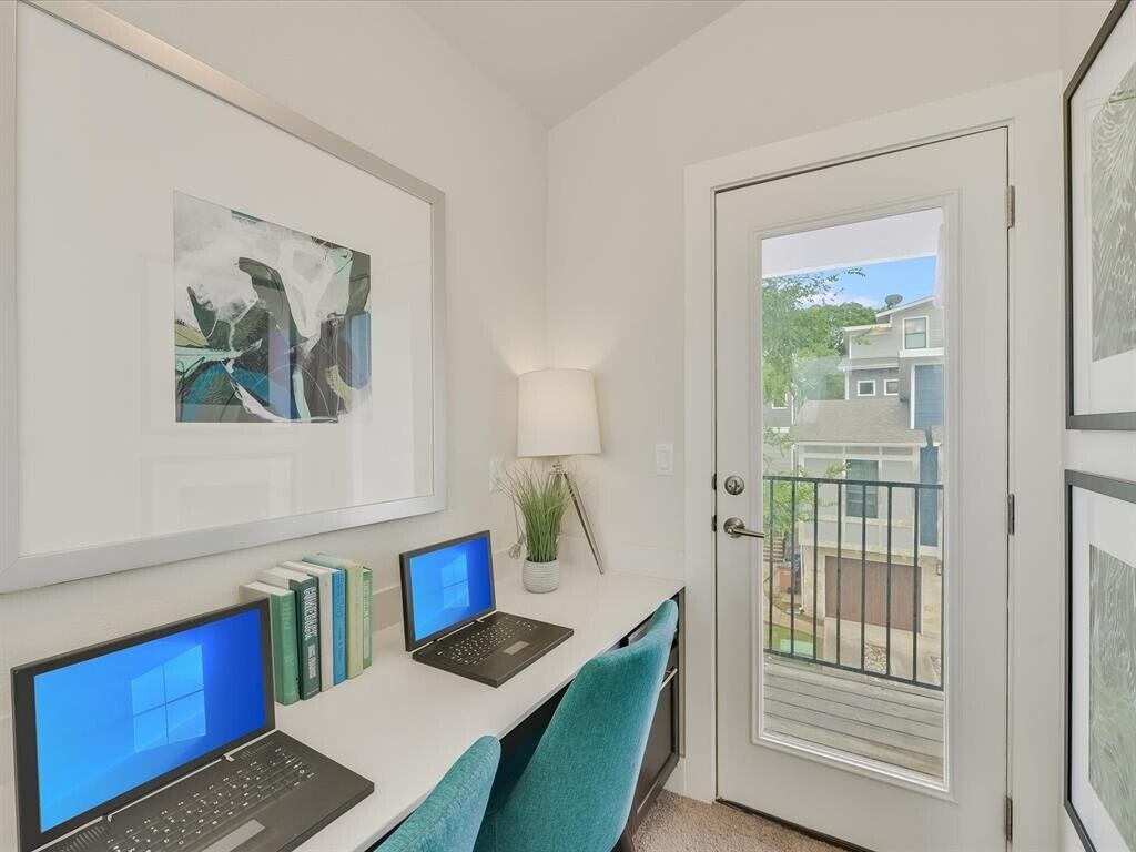 This modern Wes Peoples home in East Austin offers both convenience and style. Located just minutes away from Interstate 35 and Highway 71, it provides easy access to everyday necessities and downtown Austin. Inside, you'll find a phenomenal open floor plan, with the kitchen seamlessly integrated into the living area. The kitchen boasts luxurious features such as a 4-burner gas range, a sleek undermount double sink, a walk-in pantry, and elegant silestone counters. The spacious primary suite upstairs features a double vanity, a walk-in shower, and a generously sized walk-in closet. Additionally, there's another bedroom and bathroom upstairs, along with a bonus tech nook perfect for a home office or study area. Enjoy outdoor relaxation on two private balconies, and take advantage of the rare amenity of a 2-car garage. This home combines modern comforts with thoughtful design touches, making it a fantastic option for those seeking a contemporary lifestyle in East Austin.