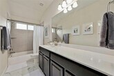An impeccably maintained home in the beautiful Hills of Bear Creek neighborhood. This stunning 2 story home features an open layout with high ceilings and multiple living and entertaining spaces. As you enter, you are greeted by the open concept living/kitchen/dining space. The exceptionally tall ceilings fill the space with warmth and light. The kitchen features stainless steel appliances, upgraded 42†cabinets, and ample counter space. The large walk-in pantry/laundry room provides storage and convenience to the main areas of the home. The primary bedroom is a perfect retreat on the first floor. Unwind in after a long day in the spacious suite large enough for a king bed and seating space. The light rich floors and paneling are beautiful upgrades. The primary bathroom features a large double vanity, a soaking tub, a walk-in shower, a separate water closet, and a large walk-in closet. Upstairs features an open flex space wired for surround sound, ideal for a game room, media room, office, home gym, or play area. The secondary bedrooms are conveniently located on the second floor near the 2nd full bathroom. The backyard features a large covered patio and a beautiful open green space. The home is wired for Vivant Security and the system is ready to be activated by the new tenant. Enjoy a conveniently short walk to the community pool and trails, as well as the convenience of nearby restaurants, grocery stores, and shopping.