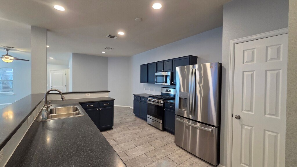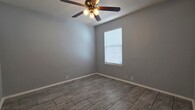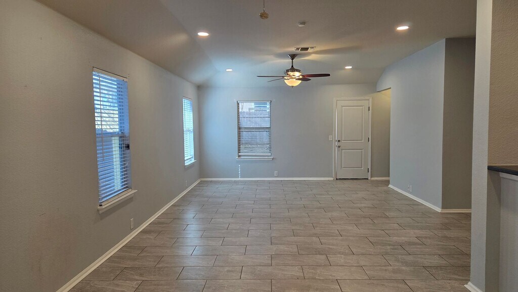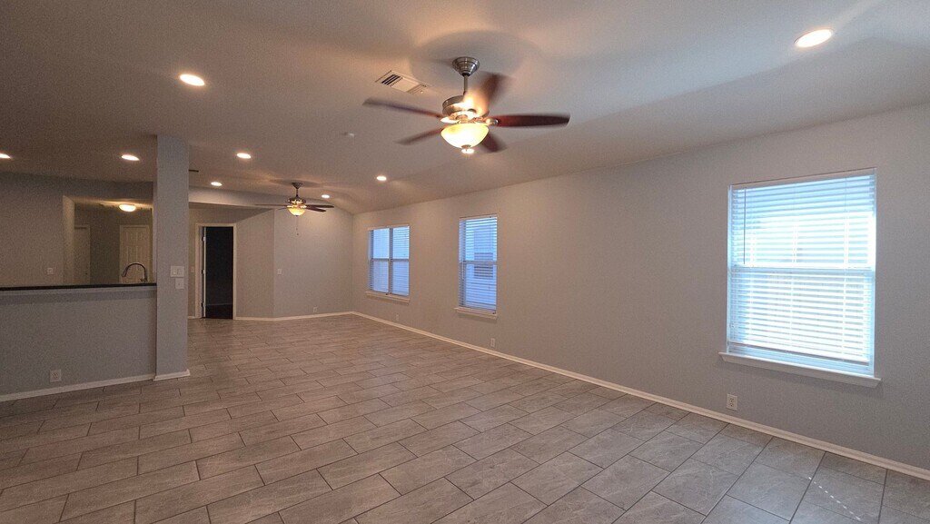 3 bed + office, 2 bath single-story with 1,753 sqft and no carpet anywhere. Ceramic tile runs throughout the main living areas, with wood flooring in the primary bedroom and dedicated office—clean, durable, and easy to maintain. The main living space is open and flexible, with recessed lighting, ceiling fans, and wide sightlines from the living area into the kitchen. The kitchen features dark cabinetry, solid surface countertops, a large breakfast bar, and stainless steel appliances including a gas range, built-in microwave, and French door refrigerator. There’s ample prep space and storage, plus a walk-in pantry for added convenience. The office sits off the main living area, ideal for working from home or a quiet flex space. The primary suite is set apart from the secondary bedrooms and includes wood flooring, a large walk-in closet, and a spacious en-suite bath with dual vanities, granite counters, a soaking tub, and a separate walk-in shower with tile surround. Secondary bedrooms are well-sized with tile flooring and share a full bath. The layout offers privacy between rooms while still maintaining an open feel in the common areas. Out back, you’ll find a fully fenced yard with mature trees and space to personalize—great for outdoor seating or pets. The home also includes a two-car garage and interior laundry area. Convenient access to major roads, shopping, and everyday essentials. Schedule a showing to see how this layout fits your needs.