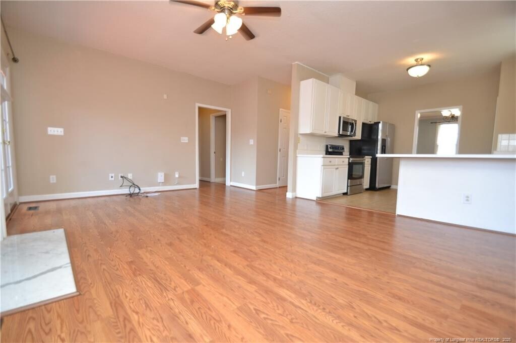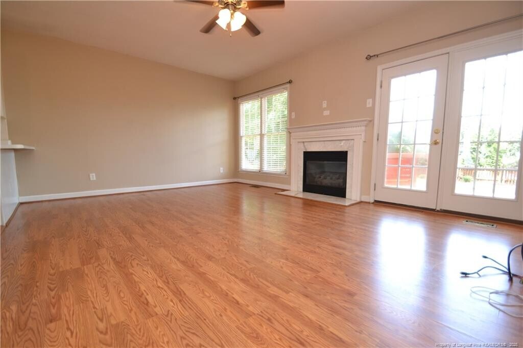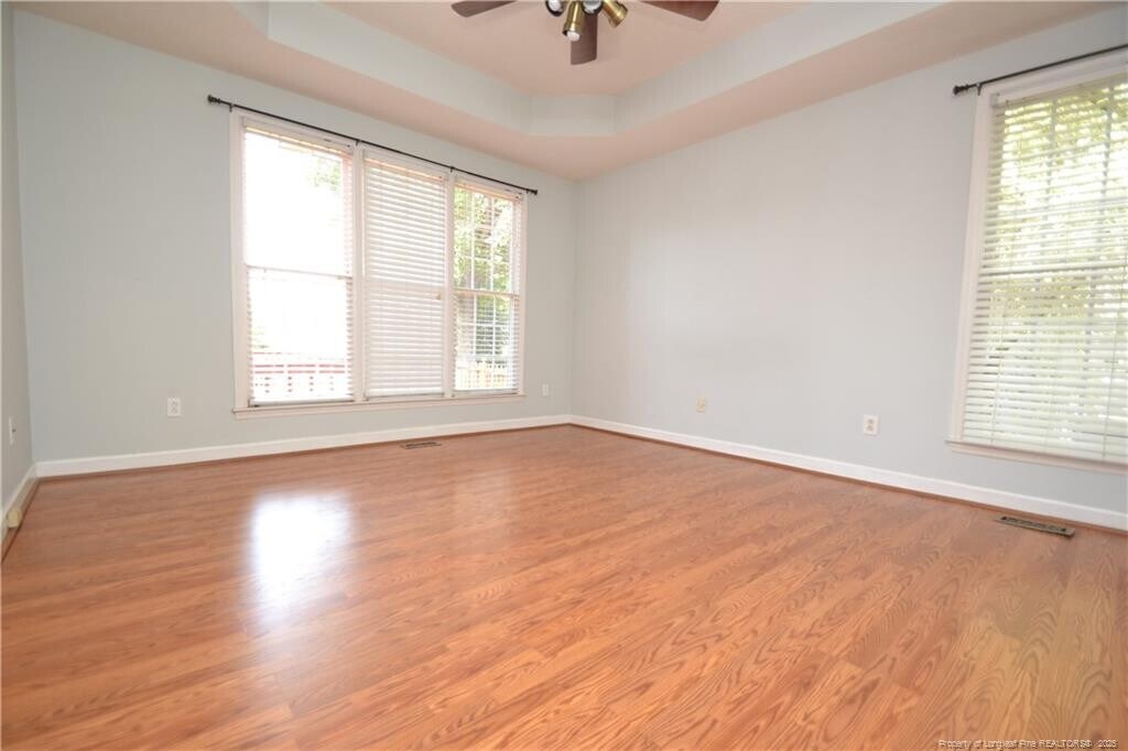 Come visit 1921 Spanish Bay Court and prepare to fall in love! This property is located in Raleigh's Hedingham neighborhood - a luxurious development offering miles of walking paths, a playground, a golf course, a sparkling swimming pool and more. A private driveway, an attached 2 car garage and a covered front porch welcome you home. Upon entering, you're greeted by a light-filled and welcoming interior with space in all the right places. The foyer opens on the left to a perfectly-proportioned diing room with double windows, a tray ceiling and a chandelier. The dining room also offers direct access to an adjoining kitchen showcasing timeless white cabinetry, a pantry, a breakfast bar and a suite of sleek, stainless-steel appliances (including a smooth-top oven and a refrigerator with ice/water in the door). The kitchen also boasts acres of counterspace, a tiled backsplash and an enameled sink with a picture window above. The kitchen is open to and adjacent family room of epic proportions. This room features plank flooring, a ceiling fan, a centrally-located fireplace with provisions for a flat panel TV above, double picture windows and a full-length glass door to the back deck. 1921 Spanish Bay Court also offers a sought-after first floor primary bedroom that makes life easier! Here, you'll find plank flooring, no less than 4 windows, a tray ceiling with a ceiling fan, a walk-in closet and a luxurious, en-suite bathroom with tiled flooring, dual sinks on an elevated, marble-topped vanity, a garden tub and a separate shower with a glass door. Before heading upstairs, be sure to visit the conveniently-located 1st floor laundry room with washer and dryer provided for resident's use. Take a quick jaunt to the second floor where you'll find two more bedrooms; both generously-proportioned with ample closet space, lovely natural light and easy access to a full hall bathroom with tiled floors and a tub/shower. The backyard must be seen to be believed! You'll step of the back of the house onto an expansive, multi-tiered deck with room for an outdoor living area, a picnic area and a BBQ space. The deck overlooks a beautiful fenced-in yard with established landscaping, shade trees and views of the community lake as well.