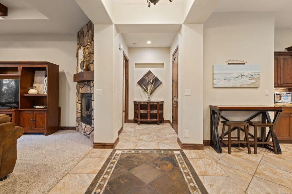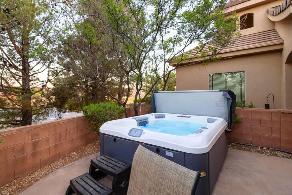 Feel at home in Poolside Place, a charming single-level 3-bedroom, 2-bathroom home in a peaceful Coral Ridge community in St. George, Utah. This home features a fully equipped kitchen with modern appliances and a dining space. The cozy living room includes plush seating, a gas fireplace, and a large entertainment center. Enjoy high-speed 500mbps fiber internet throughout the home, a laundry room with a full-size washer and dryer, and smart TVs. A private fenced patio offers outdoor dining, a BBQ grill, and lounge chairs. Garage parking and extra parking right across the street are available. Enjoy access to two community pools, with the upper pool heated year-round to 87 degrees, and two hot tubs heated to 102 degrees. The clubhouse gym and game room are also available for use from 7 AM to 10 PM. Located just minutes from outdoor adventures, golf courses, and downtown attractions, this home offers easy access to Razor Ridge Park and a fishing pond from the back of the house. Quiet hours are between 10 PM and 6 AM. Guests are responsible for placing daily trash in the outdoor garbage receptacles on the curb Sunday evening for a 6:00 am pick up time Monday morning, if staying over a Sunday. Garbage and recycling receptacles can be found at the front of the home or in the garage. [SI]