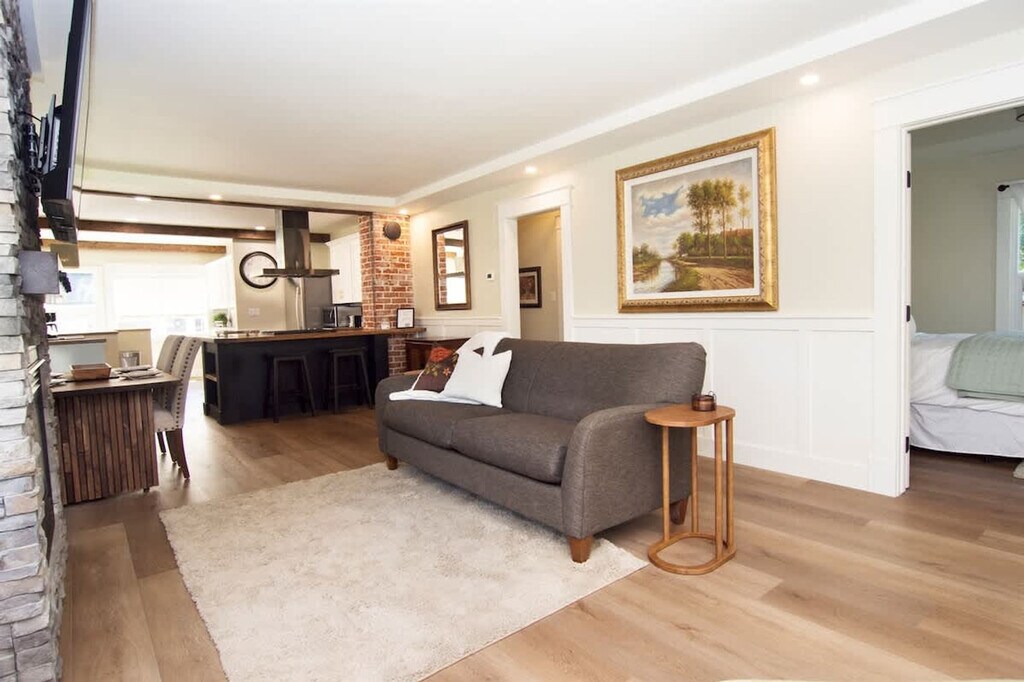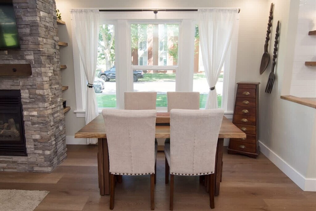 Feel at home in this charming Craftsman bungalow across the street from the College of Idaho, offering easy walking access to campus events, sports, and the County Fair & Rodeo Grounds. This recently renovated 2-bedroom, 2-bath home is filled with natural light, hardwood floors, and open living areas. Designed for both comfort and connection, this single-level home features a great room with a cozy gas fireplace and an open floor plan that flows into a kitchen with a pantry, island, butcher block countertops, and concrete accents. The kitchen includes a built-in dishwasher and oven/range for easy meal prep, and a built-in workbench adds functional space for storage or projects. Stay cool with central air conditioning and enjoy reliable warmth from forced-air natural gas heating. Well-behaved pets are allowed with prior approval and a fee of $50 per stay. Located near Caldwell’s Indian Creek Plaza and local restaurants, "The Boone" blends convenient access with classic character and modern comfort. From Boise Airport (BOI), the home is approximately 30–35 minutes (28 miles) away. From Ontario, Oregon, the home is approximately 35–40 minutes (35 miles) away. Late check-outs beyond 30 minutes without prior approval will incur a $300 fee. Parties, events, and unauthorized gatherings are strictly prohibited, and violation may result in immediate termination of the reservation without a refund and an additional cleaning or disturbance fee. Smoking (including vaping and cannabis) inside the home will result in a $250 cleaning fee. Additional unregistered guests may incur a $100 per person per night fee. Quiet hours are from 10:00 PM to 8:00 AM. Tampering with security devices is strictly prohibited and will result in cancellation without refund. [SI]