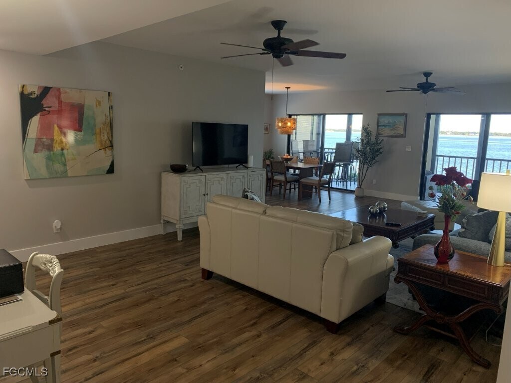 Indulge in waterfront living year-round with incredible daily SWFL sunsets & frequent playful dolphin sightings at this stunning,1st-floor end unit Sunset Royale condo,located directly on the Caloosahatchee River in Downtown Fort Myers! With 1683 sq. ft,this roomy condo features 3 bedrooms,2 full bathrooms (step-in shower in the primary bathroom,with a shower/tub combo in the guest bathroom),all warranted kitchen & laundry appliances,stainless steel kitchen appliances,granite countertops,eat-in kitchen,formal dining room,new laminate flooring throughout (zero carpet),ceiling fans in all rooms,& more! The large main screened lanai has access from both the dining room & living room,with a separate,private screened lanai off of the primary bedroom! Enjoy a resort-style lifestyle with access to a heated pool,fitness center,new fishing pier,tennis & pickleball courts,horseshoes,library,& more! Fantastic location with shopping,dining,entertainment,grocery,& beyond,all within walking distance to Downtown Fort Myers! Water,sewer,trash,amenity access,Resident Benefit Package,single covered carport space & the only storage unit in the complex included! Pets & smoking/vaping prohibited. Available now! Don't miss your chance to live in paradise! The Application Fee is $100 PER ADULT. One-time lease administrative fee of $225. Please note that properties within an Association may have an additional application process,will be subject to an additional fee(s) and an additional approval process.