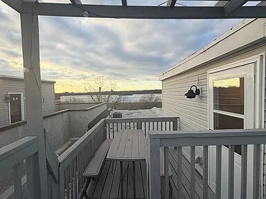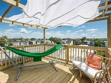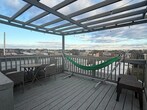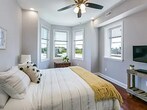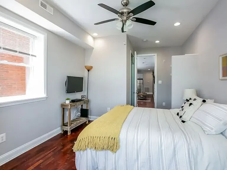 Property Id: 2377020 This light-filled urban apartment features an open concept living area with rich hardwood floors and a modern, neutral color palette throughout. The main living space seamlessly combines a compact dining area with a cozy lounge, anchored by a wall-mounted television and large windows that invite plenty of natural light. The kitchen is efficiently designed with sleek white cabinetry, a subway tile backsplash, and full-sized stainless steel appliances, including a gas range and dishwasher. Recessed lighting and clean architectural lines enhance the home's contemporary feel, while a prominent wooden staircase suggests a multi-level layout. The private bedroom serves as a peaceful retreat, showcasing a large bay window and an additional side window that brighten the space. A ceiling fan provides comfort above the bed, which is styled with textured linens and a warm mustard-yellow throw for a pop of color. Practicality meets style with a rustic wooden console table for the bedroom television and a vintage-inspired trunk for extra storage. Throughout the home, thoughtful details like indoor greenery, patterned area rugs, and minimalist wall art create a welcoming and cohesive atmosphere perfect for modern city living.