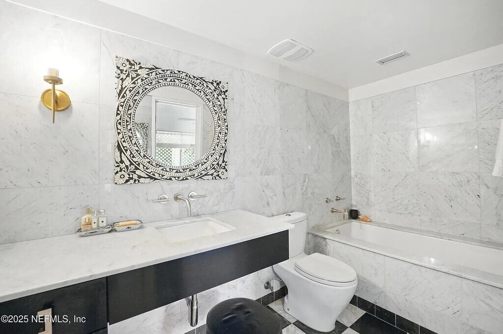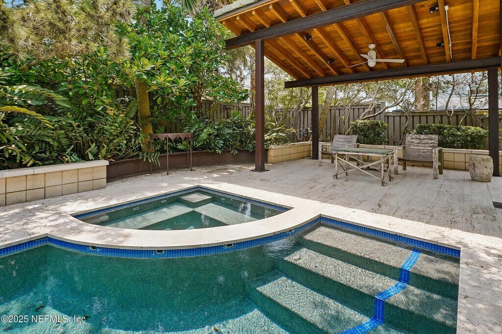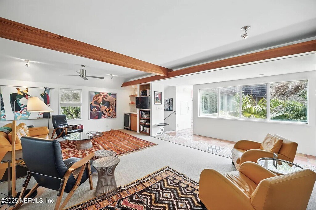 This unique architectural masterpiece is available for short term rent for a minimum of 90 days in beautiful Atlantic Beach. This 4 bedroom, 4 bathroom home designed by the famous William Morgan is just one block from the beach on a double lot (.54 acres) with tons of beautiful, mature greenery. With over 1,800 square feet of outdoor living area, this property is a sprawling property for a large family or group. Game room with bunk beds inside the three car garage, includes brand new golf cart that holds 6-9 people, pool, back entrance to easily access the public beach access just one block away, fire pit and hammock all offer lots of room to enjoy for your stay.