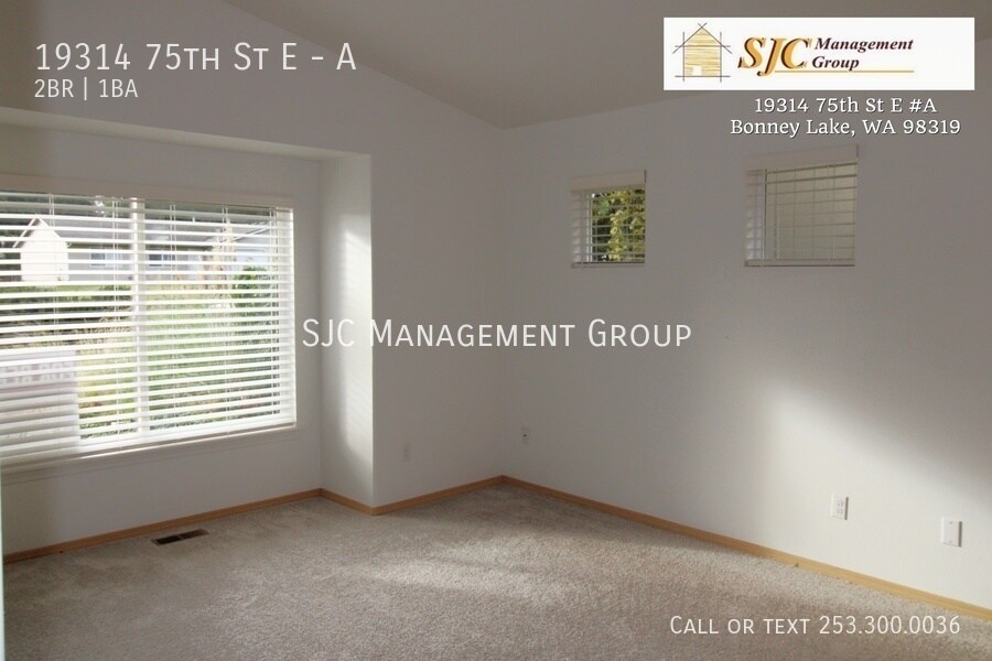 Freshly updated, single-story 2-bedroom duplex located in the beautiful Bonney Lake community, just minutes from Lake Tapps, parks, restaurants, and shopping. The offset layout offers added privacy, with living spaces separated by attached garages. Vaulted ceilings and multiple skylights create a bright, welcoming interior. The primary bedroom features a walk-in closet and en-suite bathroom. The spacious open living area includes a cozy corner gas fireplace and flexible options for placing furniture. The kitchen offers newer appliances, generous counter and cabinet space, a pantry, and an island with seating. Additional features include a laundry room with washer and dryer, a second bedroom, and a full guest bathroom. The semi-private backyard includes a concrete patio, perfect for outdoor seating and BBQs. Attached one-car garage included. Note: Stairs required to enter/exit the house through the garage. NO pets For more information or to set up a viewing, please contact the leasing team at SJC Management Group today! MOVE IN COORDINATION FEE $250 NOTE This property is placement service only, the owner will be managing the property directly. Utilities: Tenant responsible for all utilities