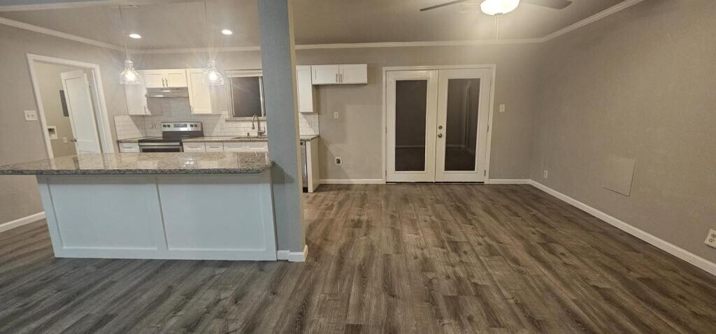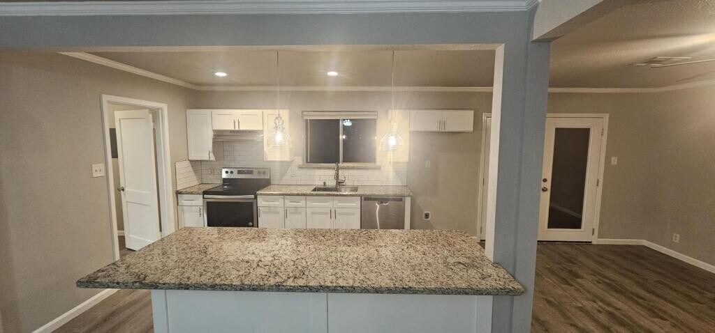 Open plan with central A/C and heat. Kitchen has eat-at island, granite countertops, stainless steel appliances. Laundry room with cabinet and walk-in pantry. 3 bedrooms with ceiling fans, walk-in closets. 2 car garage. Dining room with french door leads to fenced in back yard.