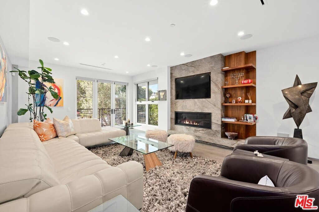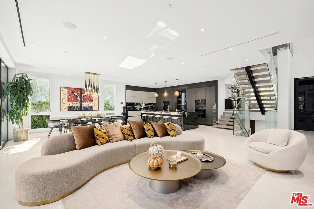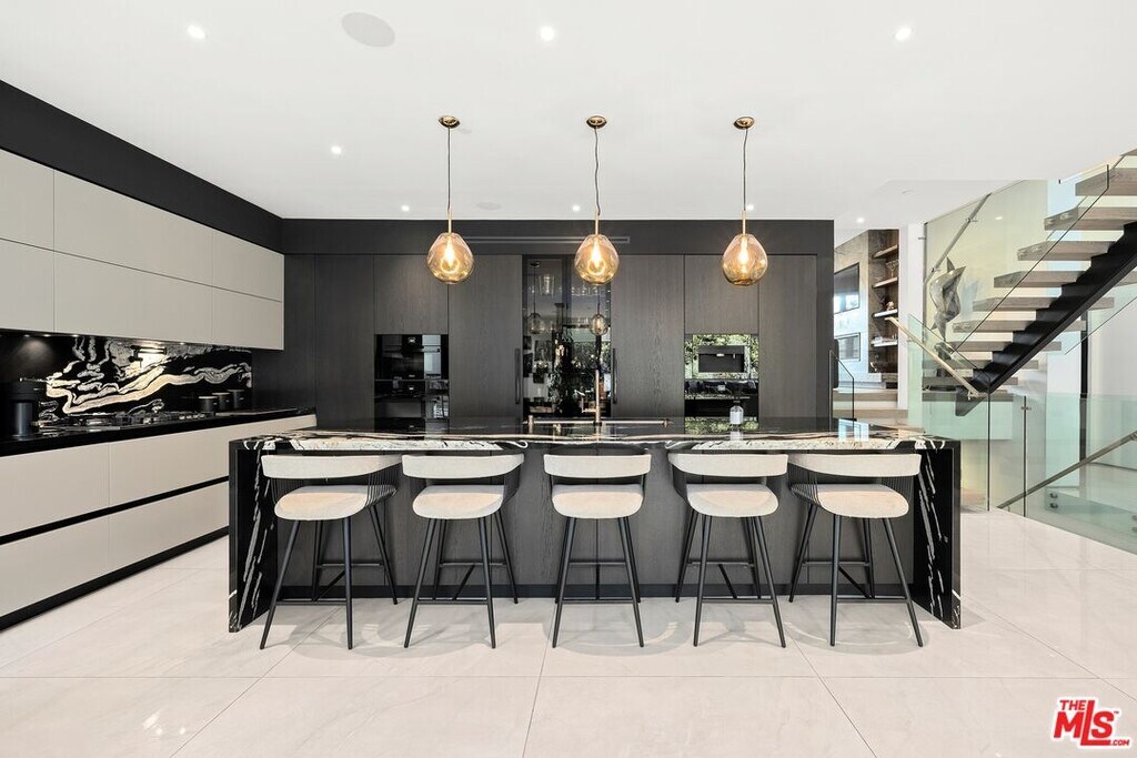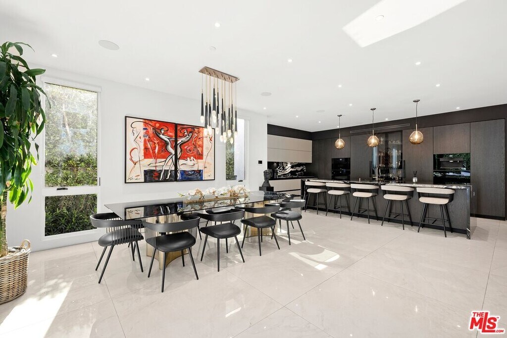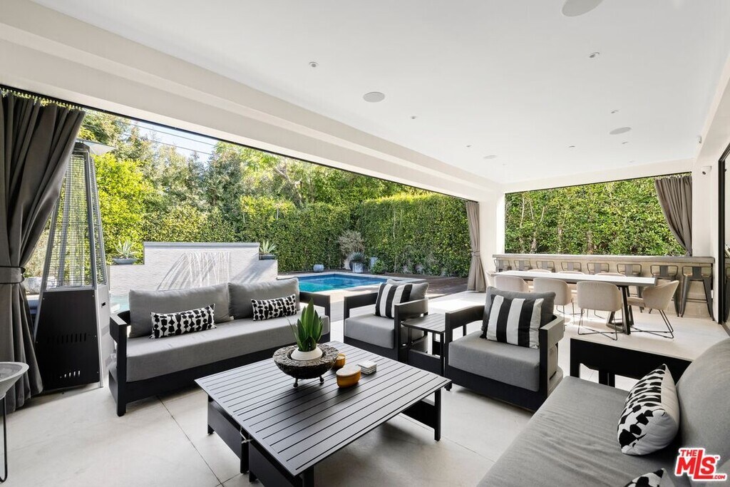Wonderfully situated in West Los Angeles, this newly constructed contemporary home is perfectly positioned between Century City and Westwood. A sizable 6,800 sqft is laid out over three stories and includes five bedrooms and five full bathrooms, with tasteful details throughout. Vast entertainment spaces include highly polished floors, open room concepts, and sliding floor-to-ceiling windows that open to a loggia-style deck, which frames the pool, fountain, and spa, all within a private hedged back garden. The kitchen boasts dark cabinetry and a pull-up waterfall black marble island with Miele chef-grade appliances. Rounding out the main living space is a dining area with room to host 10 or more guests. Each floor is accessed via a floating concrete and polished steel stairwell, a secondary front-facing den with fireplace, and balcony creates a more intimate space before leading to the bedrooms. The primary suite boasts a black marble fireplace, oversized patio doors, and an archway-covered balcony that overlooks the pool. The ensuite has a stunning dual shower walkthrough-to-standalone tub, stone-topped vanities, and brass fixtures. Other bedrooms feature matching bathrooms and balconies. Unified features throughout include porcelain wide-planked white-washed flooring, recessed lighting, bespoke cabinet work, and unique wallpapers. Further amenities include a partially subterranean games room with a wine wall, wet bar, table tennis, pool table, and a large TV, a resolute space for sports gatherings. Nearby schools include Westwood Charter Elementary, Le Lycee Francais, Wildwood, and UCLA. 1940 Kelton is located close to Westwood Village, Westfield, and the famed Sawtelle Japanese district. Property can be leased furnished or unfurnished. MLS# 25611485