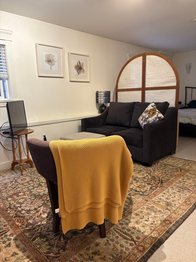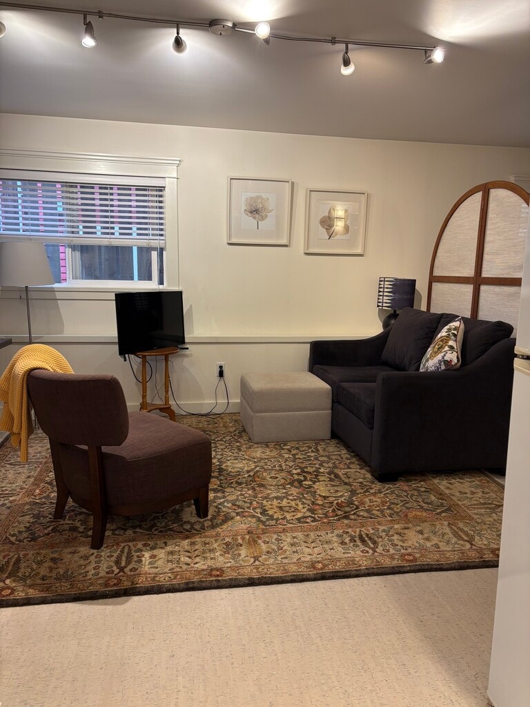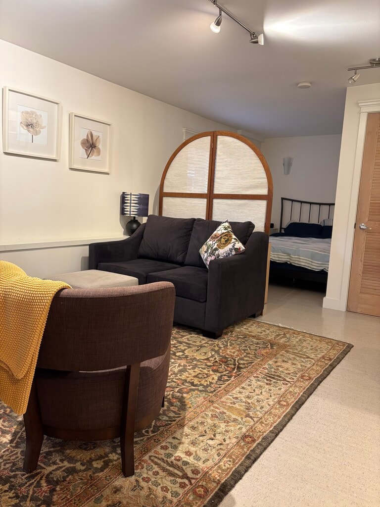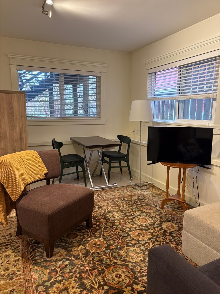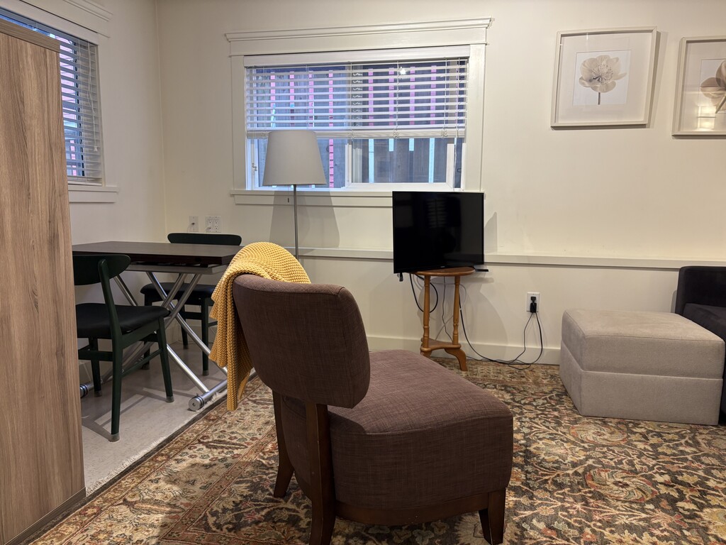 FULLY FURNISHED Small Studio just off the vibrant East Vancouver area of Commercial & Victoria Drive Suitable for an individual person only. Heat, electricity & basic wifi included. A surcharge will apply for people who work from home, to cover the additional power usage. Features: * High ceilings throughout unit, with 4 large windows allowing lots of natural light that make the small space feel much larger. * 100% wool area rug over modern cork floors. * Fully equipped kitchen with stove, oven, fridge & microwave, place settings for 4 & more. * Radiant floor heat in large tiled 3-piece bathroom with soaker tub * 32” Smart TV, Invertor microwave oven, 11cu ft fridge, electric stove w/4 burners & oven, * Electric heat throughout. * Shared laundry. Furnishings include: X-long double bed with 100% cotton linens & down duvet. Couch, chair, footstool, HDTV, oscillating fan, dining table & chairs. Dishes, utensils & cooking bowls & pans. Food storage containers. Towels, shower curtain, sheets, pillows, duvet, chest of drawers. Bookshelf/ shoe storage. 1 small closet. NO Storage available, & no inside bike storage but a secluded area for outside lock up. Suitable for a QUIET & RESPECTFUL PERSON. I am the owner & live upstairs & there is a lot of sound transfer between floors. References from previous rentals & current employer will be required. There is a cat in my home, so NO PETS ALLOWED.