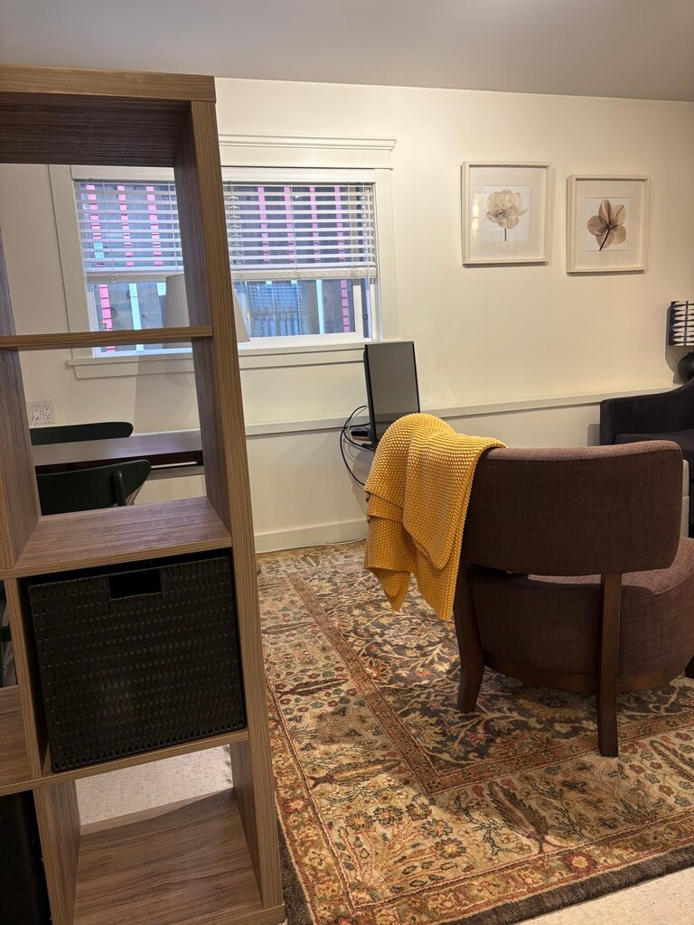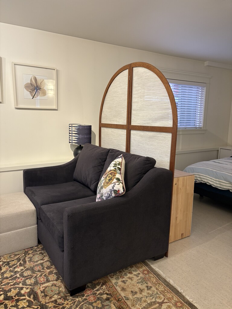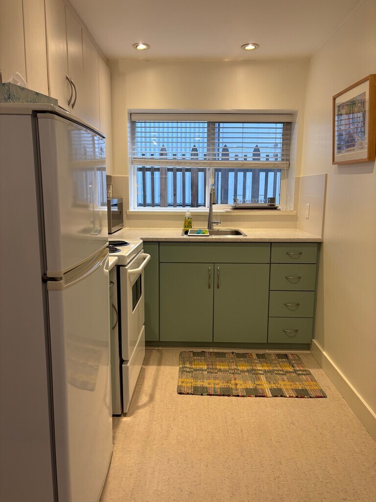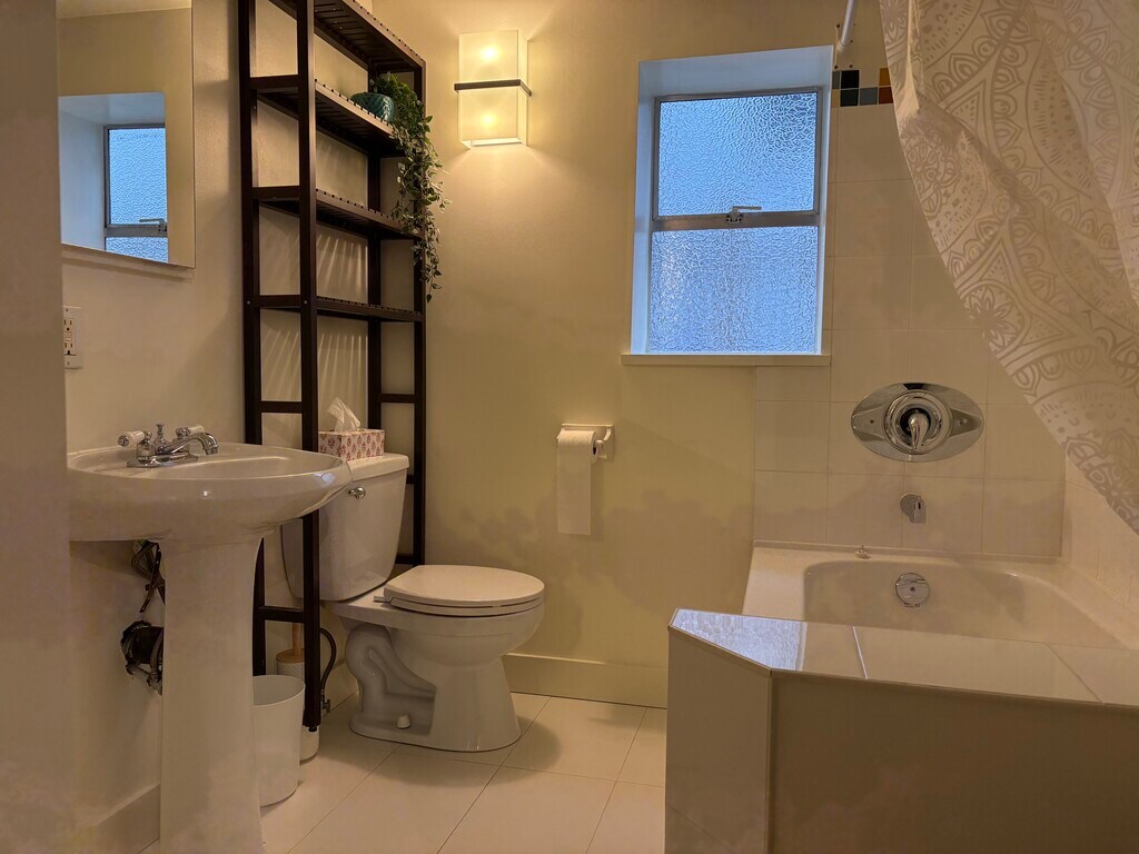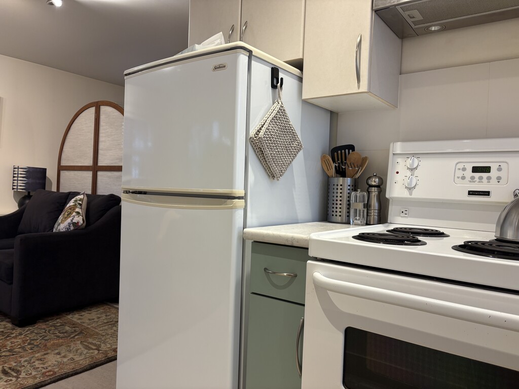 FULLY FURNISHED Small Studio just off the vibrant East Vancouver area of Commercial & Victoria Drive Suitable for an individual person only. Heat, electricity & basic wifi included. A surcharge will apply for people who work from home, to cover the additional power usage. Features: * High ceilings throughout unit, with 4 large windows allowing lots of natural light that make the small space feel much larger. * 100% wool area rug over modern cork floors. * Fully equipped kitchen with stove, oven, fridge & microwave, place settings for 4 & more. * Radiant floor heat in large tiled 3-piece bathroom with soaker tub * 32” Smart TV, Invertor microwave oven, 11cu ft fridge, electric stove w/4 burners & oven, * Electric heat throughout. * Shared laundry. Furnishings include: X-long double bed with 100% cotton linens & down duvet. Couch, chair, footstool, HDTV, oscillating fan, dining table & chairs. Dishes, utensils & cooking bowls & pans. Food storage containers. Towels, shower curtain, sheets, pillows, duvet, chest of drawers. Bookshelf/ shoe storage. 1 small closet. NO Storage available, & no inside bike storage but a secluded area for outside lock up. Suitable for a QUIET & RESPECTFUL PERSON. I am the owner & live upstairs & there is a lot of sound transfer between floors. References from previous rentals & current employer will be required. There is a cat in my home, so NO PETS ALLOWED.