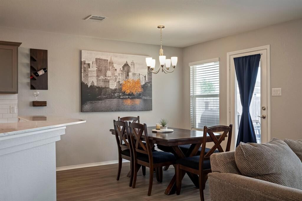 Welcome to this beautifully maintained home in the highly sought-after Presidential Meadows neighborhood of Manor. This like-new, pet-free home is bright, open, and move-in ready—offering the perfect blend of modern design and practical living. Step inside to find durable and stylish vinyl flooring throughout the main level, creating a warm and cohesive look. The open-concept layout flows effortlessly, making it ideal for both entertaining and everyday life. The spacious kitchen features sleek Silestone countertops, freshly painted cabinets, and ample counter space—perfect for cooking, hosting, or enjoying your morning coffee. With thoughtful upgrades throughout and meticulous care from its owners, this home is truly better than new—without the delays, surprises, or extra costs that often come with new construction. Enjoy your evenings under the covered back patio, ideally shaded thanks to the west-facing front of the home, allowing for year-round backyard comfort. Located in a prime spot within the community, this home is just minutes from the soon-to-open HEB, with quick access to local schools, parks, and major highways. You'll love the peaceful setting away from Highway 290, while still being close to everything Manor and the surrounding Austin area have to offer. This is an awesome home at an awesome price. Don’t miss your chance—schedule a showing today!